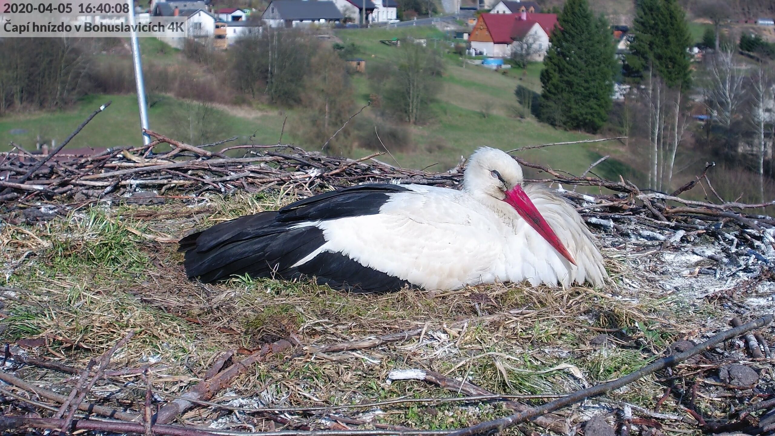 Po 235 dnech jsme se v neděli 5. dubna 2020 ve 12:23:06 konečně dočkali návratu paní domu, Bohunky. Jednoznačně ji prozradil kroužek na pravé noze s kódem DEH H9931, ale i bílé pero v jinak černých letkách na zádech. Po dosednutí na hnízdo ho pozdravila tak, jak se má domov zdravit. A přestože byla tak unavená, že ani řádně nesložila křídla, hned se pustila do úklidu. Po chvilce si zaletěla na něco k snědku, vrátila se a zase na čas zmizela. Nyní (17:00) odpočívá na hnízdě a jistě netrpělivě čeká, kdy už se objeví Bohouš. I my čekáme…