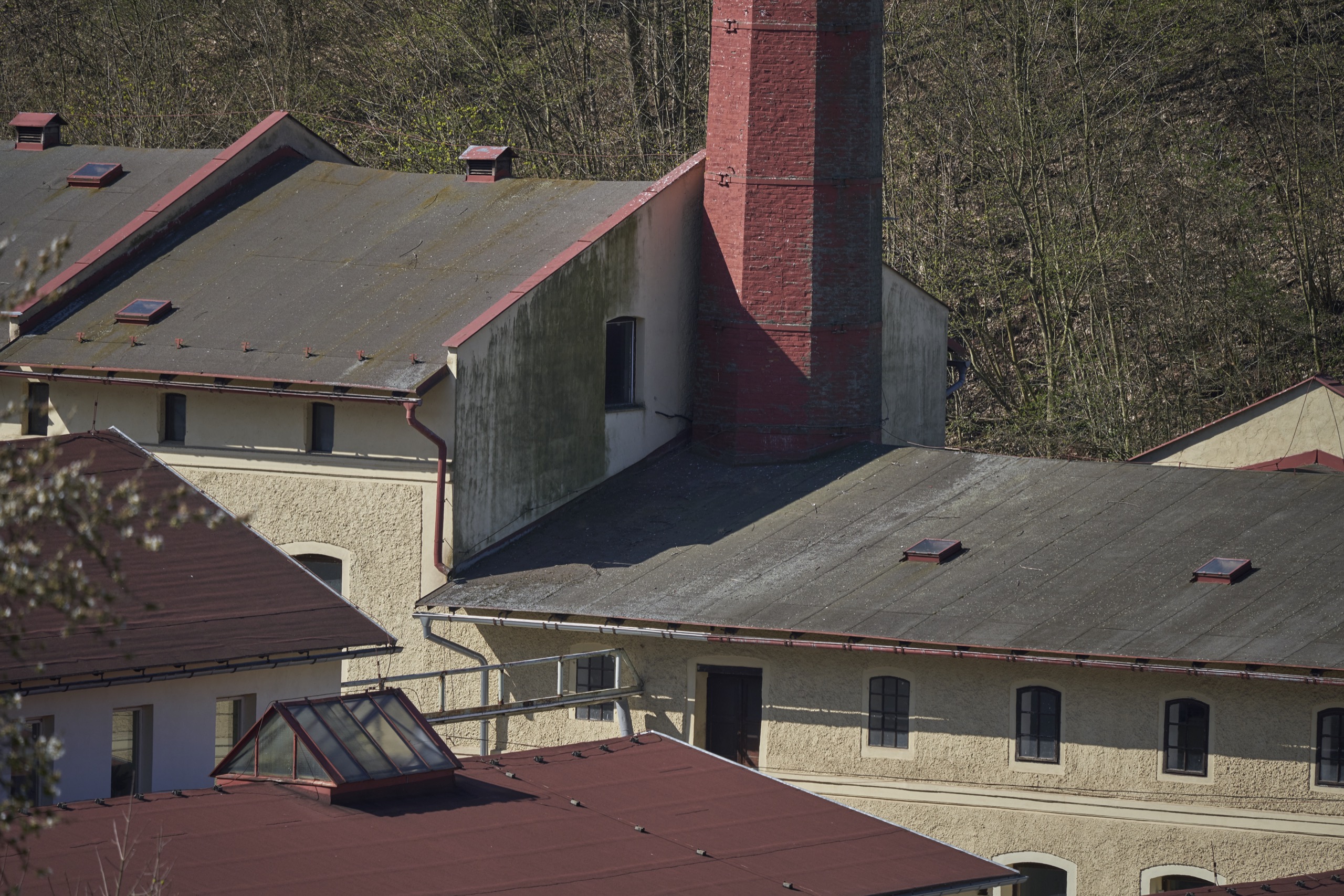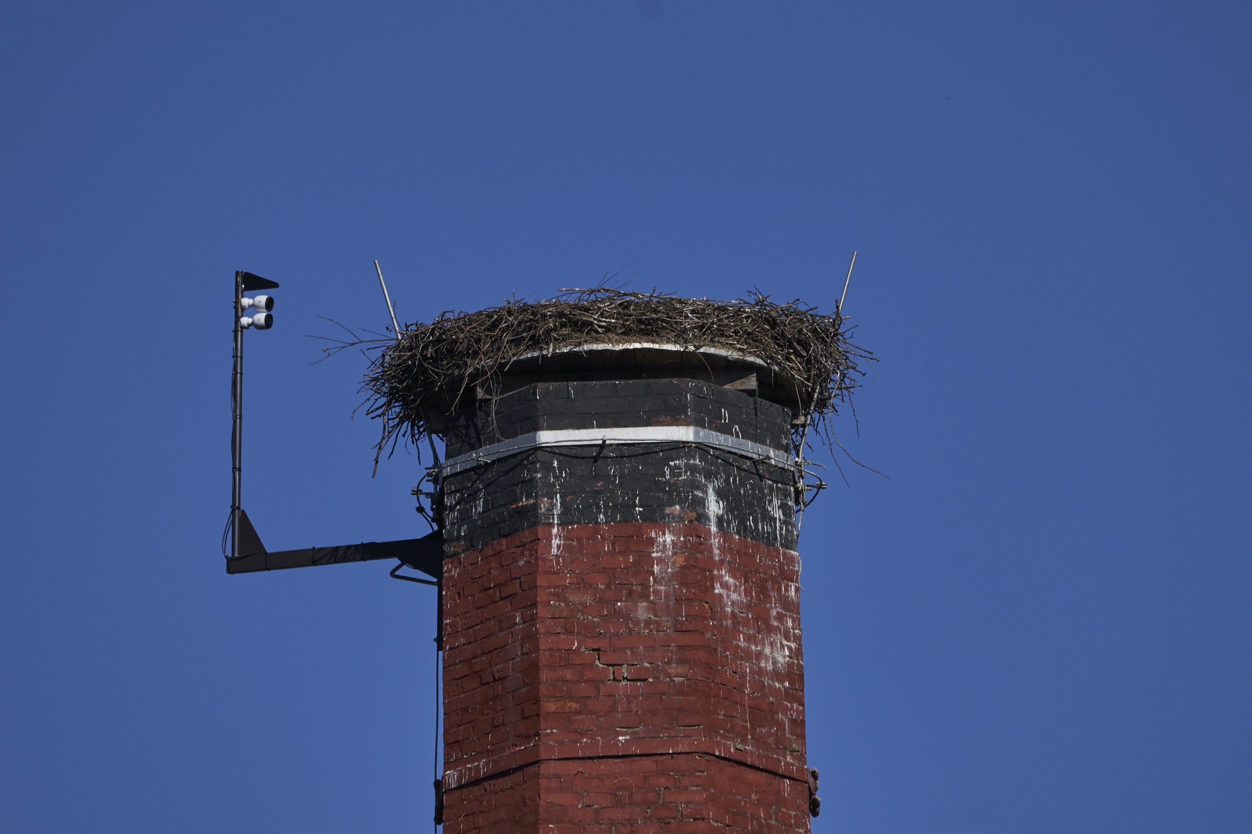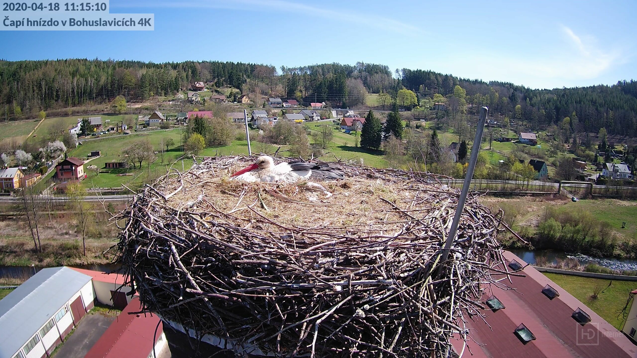 V té době byla na hnízdě Bohunka, při pohledu zespodu byla vidět jen její hlava. Při vstupu na louku nás stejně jako pozorovatele přenosu z kamer upoutala světlá skvrna na okraji asfaltového vjezdu. Nejednalo se však o vylitý beton – jak proběhlo na chatu, ale o hromadu popela ze spáleného klestí, vyřezaného v okolí silnice. Na komíně se toho moc nedělo, naši pozornost tak upoutalo jeho okolí. Na suchém smrku na kopci za továrnou (z pohledu kamery za jejími zády) seděly 4 volavky. Jedná se o stejný strom, na kterém loni sedával Slávek “Kafka” po svém vyhnání z hnízda. Volavky často přelétávaly nad hnízdem i vedle něj, ale zdálo se, že čápi si z nich moc nedělají. Ve výšce se pak vznášelo hejno racků. Přešli jsme louku až k řece a Lukáš pořídil několik snímků komínu z podhledu.