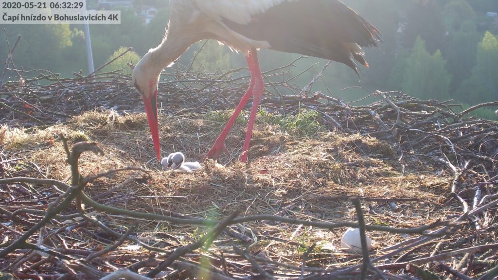 Po celonočním snažení spatřilo dnes ve 4:59 světlo světa třetí čápě. Klubání mu trvalo vcelku dlouho, protože první otvor ve vajíčku byl viditelný již včera brzy ráno. Nejdůležitější ale je, že se dílo zdařilo a čápě vypadá zdravé a aktivní.