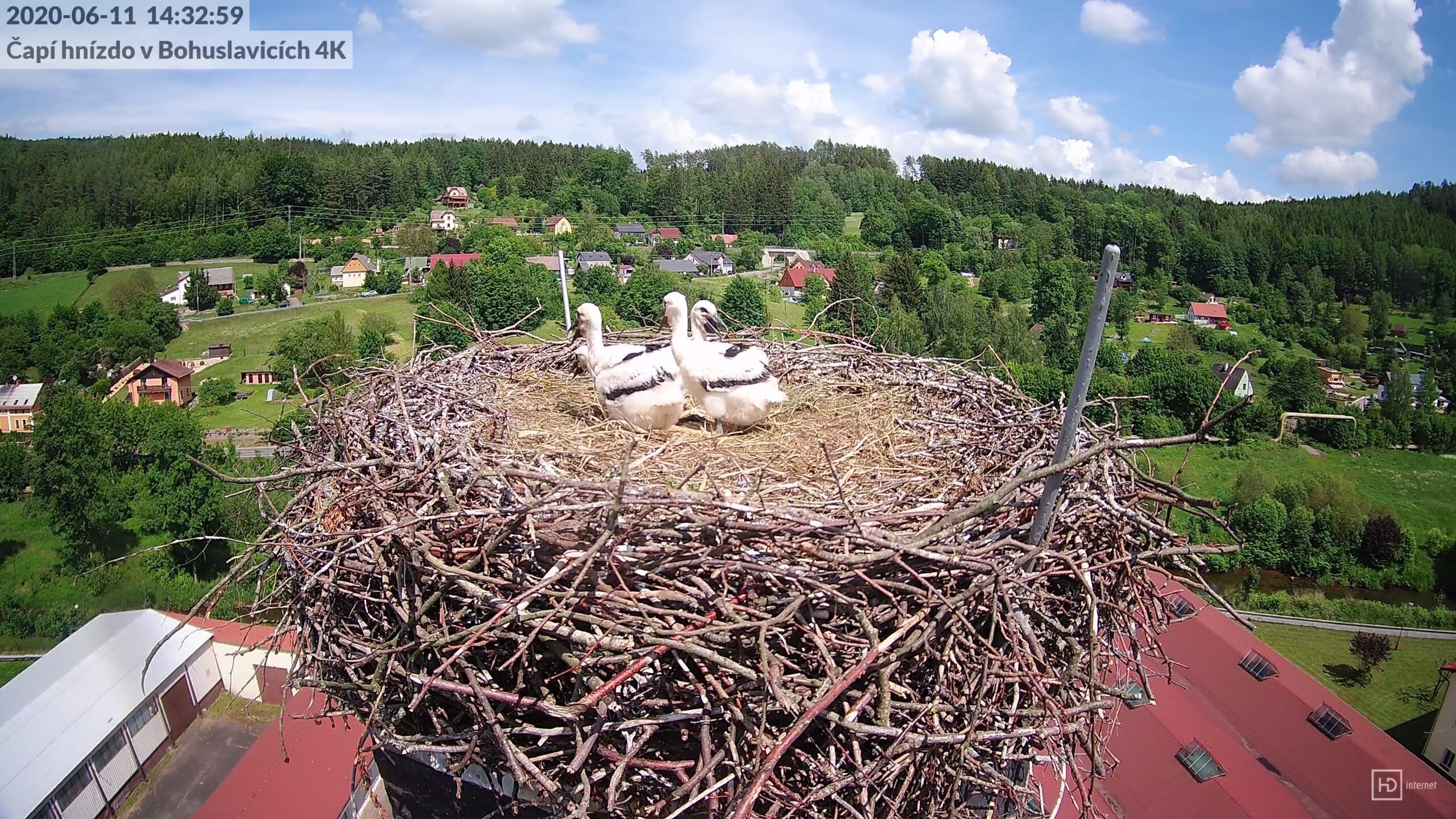 Bohunka usoudila, že čápata jsou již dost stará a velká na to, aby mohla zůstat na hnízdě alespoň chvíli samotná. A tak se ve 13:32:01 vrhla z komína střemhlav dolů k řece. Po minutě, ve 13:33:04 už byla zpět s nákladem čerstvé vody. Čápata si dnes odbyla svůj první samostatný pobyt bez dozoru rodičů. Od nynějška se takové situace budou opakovat stále častěji a období bez dozoru budou stále delší.