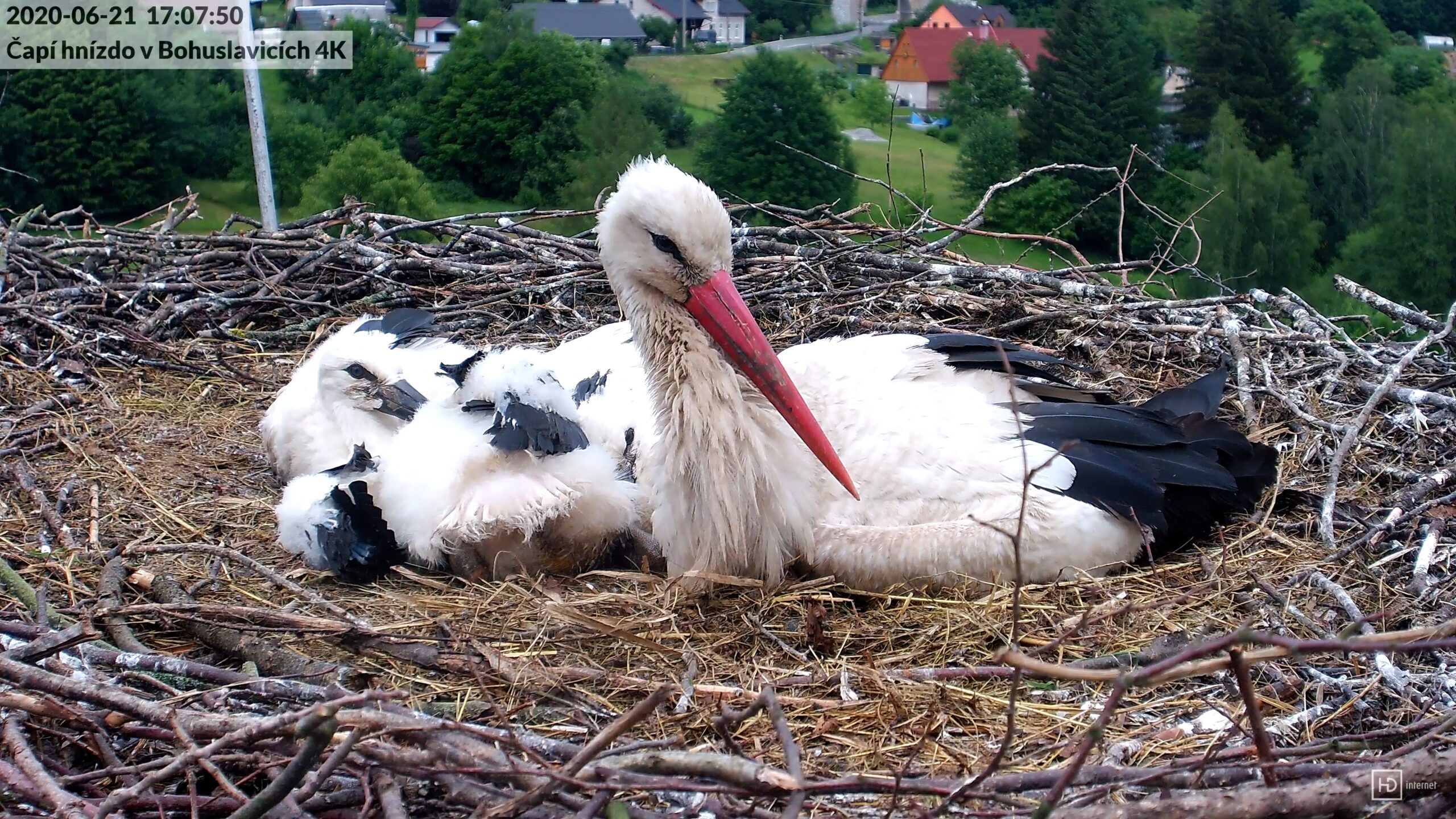 Bohouš tak mohl oslavit Den otců svým oblíbeným způsobem – hnízdoválením. Na to si však udělal čas až odpoledne a večer. Jinak se poctivě věnoval lovu, přinesl potomstvu myši a dokonce našel i nějaká háďata. Čápata se uvelebila v hnízdě, kromě spánku se věnovala péči o peří. A bylo to věru třeba, protože jejich bříška a ocásky jako by nepatřily čápům, ale zcela jiným zvířátkům. Těm, kterým se zvukově podobají v okamžicích žebrání o jídlo.