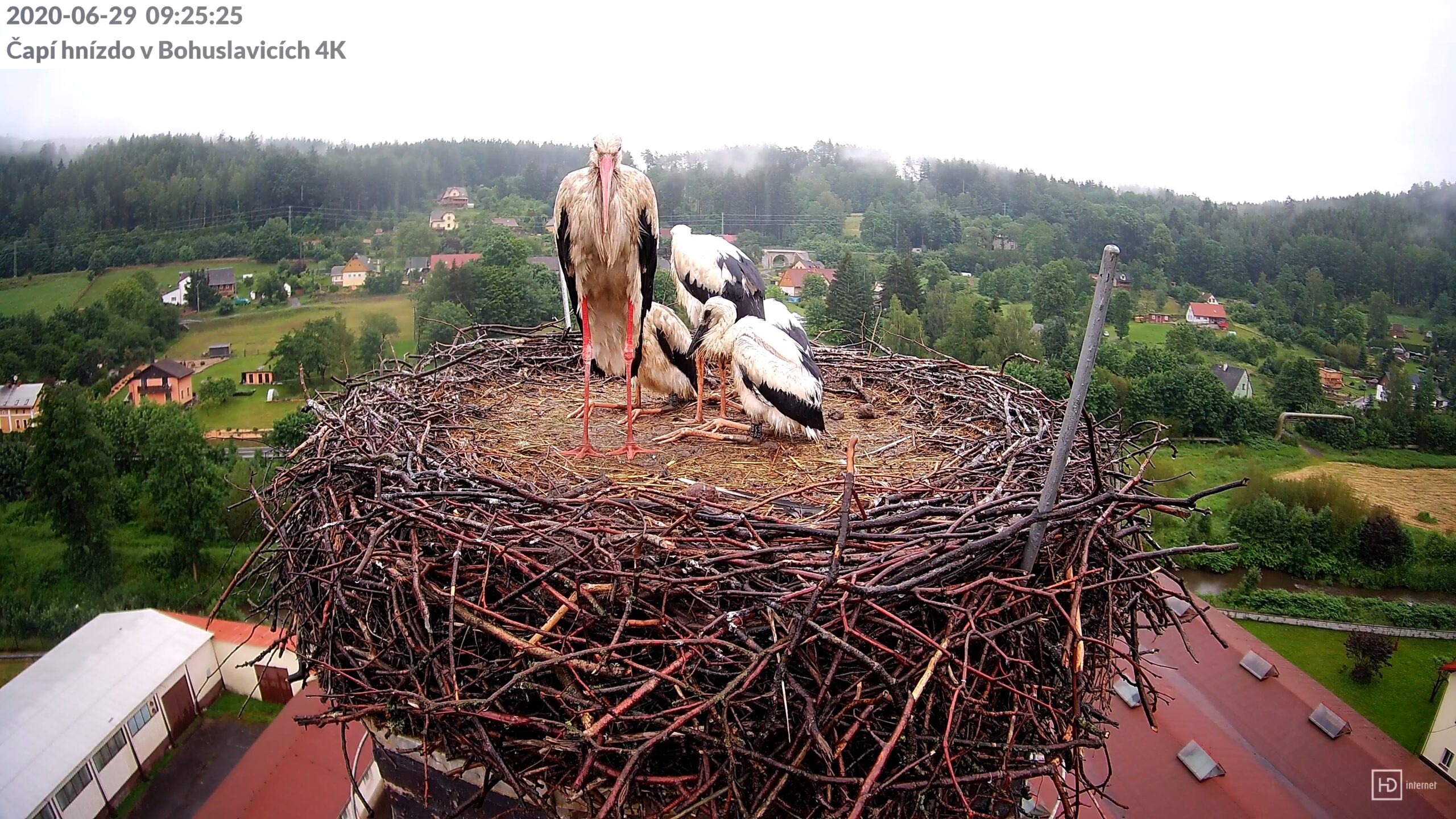 Bohuslavická čapí rodinka si letos od deště snad neodpočine. Po nedělní odpolední bouřce a večerní přeháňce začala noc na pondělí sice v suchu, ale ne nadlouho. Okolo druhé hodiny začalo mírně, ale vytrvale pršet. Déšť postupně zesiloval, maxima dosáhl během časného dopoledne (za celý den spadlo 18,3 mm srážek). Bohunka se vydala na ranní lov, zatímco čápata s Bohoušem stála v dešti na hnízdě. Bohouš se netvářil zrovna nadšeně, ale nedalo se dělat víc než čekat. Bohunka byla stále mimo hnízdo a netrpělivá dráčata začínala kvičet hlady. Před desátou hodinou déšť zeslábl a Bohunka přiletěla domů. Moc jídla ale nepřinesla, jen menší hromádku žížal, po které se jen zaprášilo.