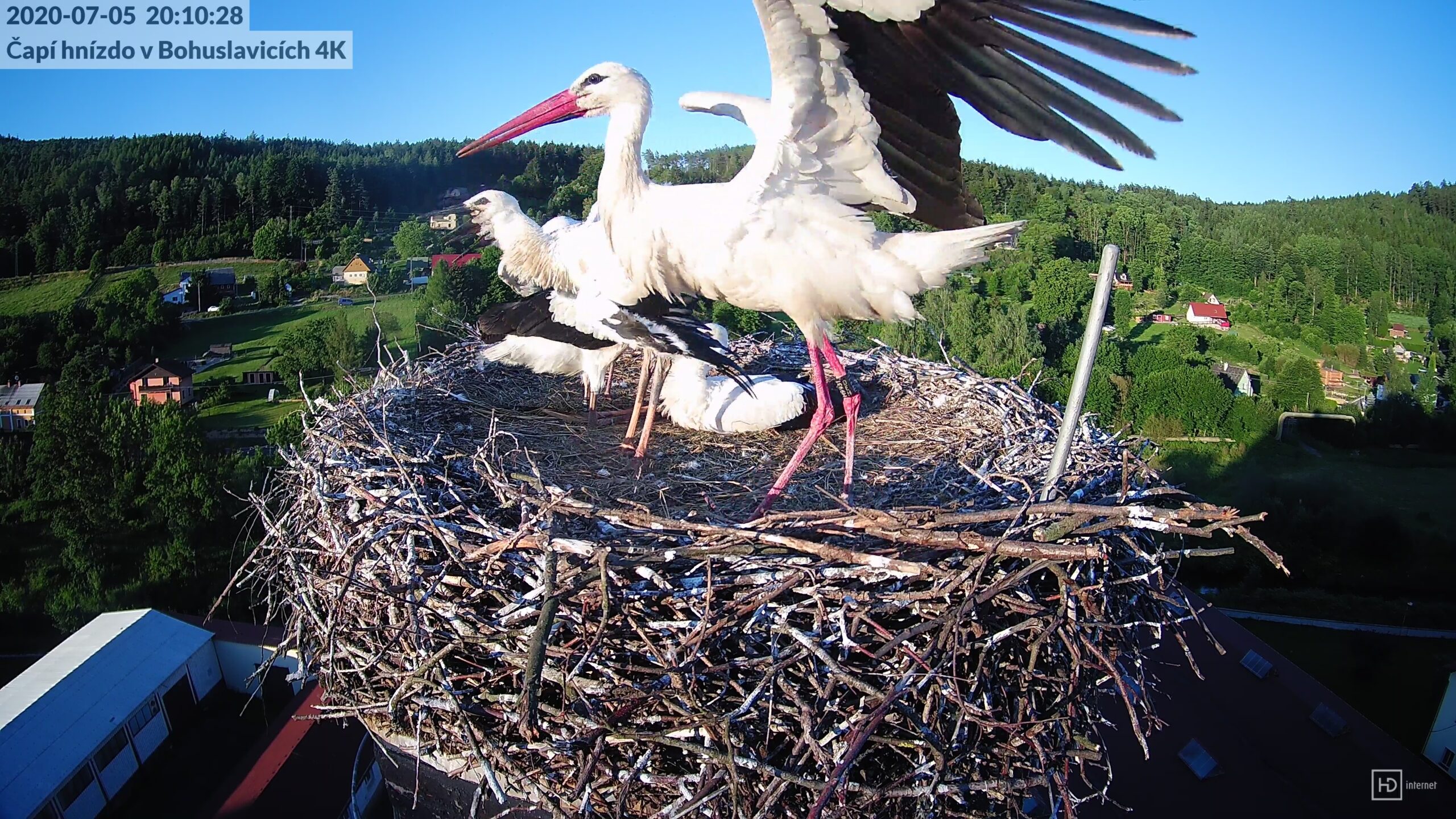Na konci prvního červencového víkendu jsme zaznamenali ještě další změnu. V minulosti obranu hnízda zajišťovali vždy rodiče a v případě nebezpečí zaujímala čápata nehybnou pozici. Před několika dny začala čápata přejímat aktivní obranný postoj. Začalo to Plaváčkovým zahnáním holuba ve chvíli, kdy byla čápata na hnízdě sama. Včera večer nad hnízdem přelétal neznámý pták – byl vidět pouze vržený stín. Bohunka začala klapat, čápata však nezalehla, ale roztáhla křídla a začala klapat také. Tedy jen ta, která “útočníka” viděla. To samé se opakovalo dnes ráno, kdy se k hnízdu přiblížil příliš blízko holub. Toho už vyprovodilo všech šest klapajících zobáků. Čápata jsou tak připravena na samostatný pobyt na hnízdě.