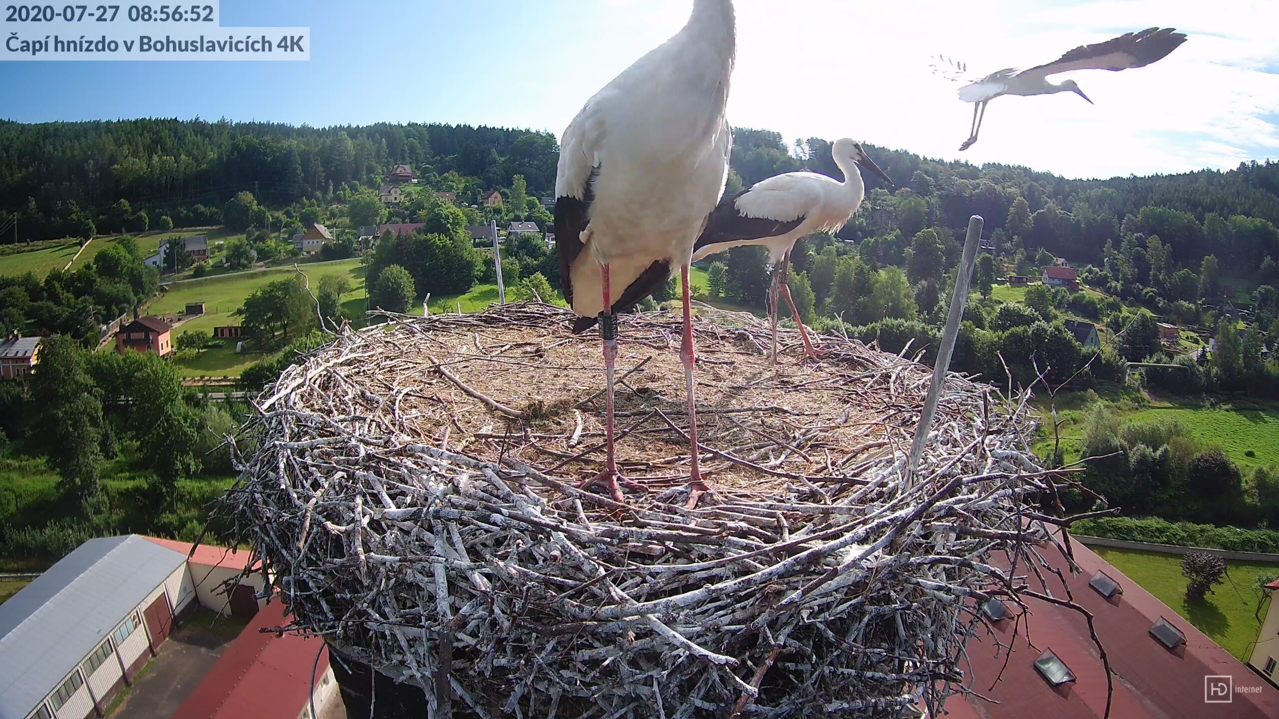 Další hromadný odlet nastal krátce před devátou hodinou. První jako vždy vyrazili Bivoj se Ctiradem. Tentokrát to ale Šárka nevydržela a vyletěla za nimi v 8:56:51. Hned po ní odstartovala i Bohunka. Plaváček tak zůstal na hnízdě poprvé zcela sám. Šárka provedla pouze jeden oblet komína a v 8:57:25 (po 34 sekundách letu) šla na přistání. To se jí příliš nepovedlo, neboť klesala na hnízdo z výšky a příliš rychle. Dopadla do kleku a zobákem se zaryla do ohrádky z větví. Do karambolu se navíc připletl zmatený Plaváček. Nikdo naštěstí neutrpěl zranění, Šárka hned vstala, i když nožky se jí poněkud klepaly. A Plaváček ji nakonec za její výkon hezky zaklapal.