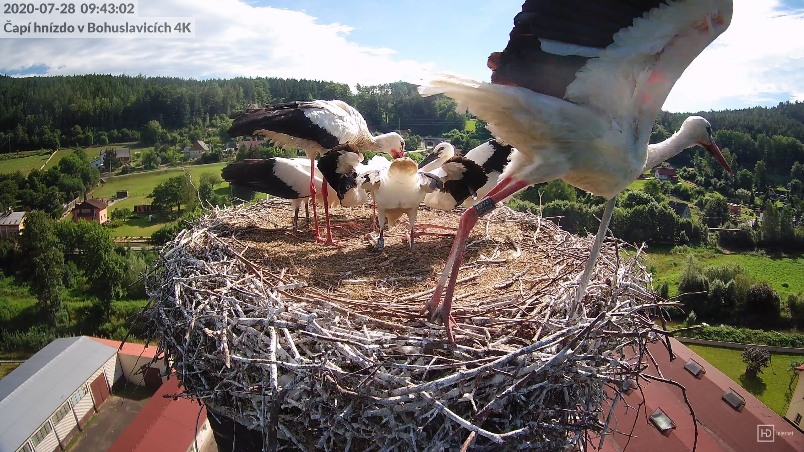 Teplota po poledni vystoupala až k + 32°C, slunce žhnulo i přes oblaka. Foukal svižný jižní až jihozápadní vítr, takže do letu mladým čápům příliš nebylo. Bohouš jim opět donesl vodu ke svlažení a pak nám ukázal, jak si čápi nanášejí na nohy “opalovací krém”. Mladí zjevně vědí jak na to a mají nožky pěkně počápené. I Bohunka předvedla své nové bílé podkolenky.