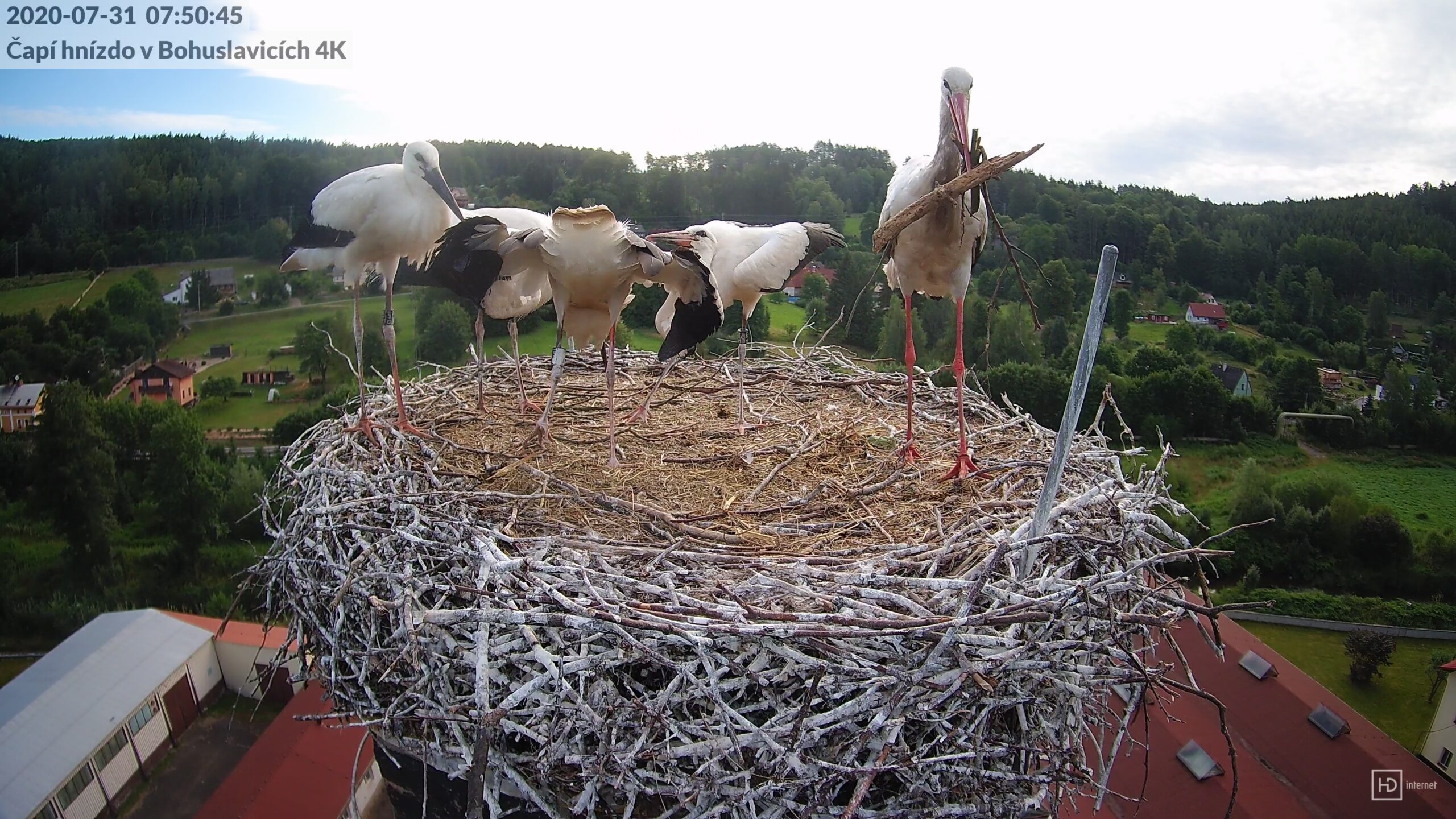 Na tuto odpověď se nám dnes pokusil podat odpověď Bohouš, když v 7:50 přistál na komíně s pořádným špalkem. Nechal ho ležet na okraji hnízda a mladí čápi se později přeli o to, zdali ho mají pořezat či naštípat (nebo shodit dolů). Poslední červencový den však rozhodně zimu nepřipomínal, po celý den bylo skoro jasno. Sluneční paprsky vyhnaly teplotu nad hranici +27 °C a horko jen občas zmírňoval severozápadní větřík.