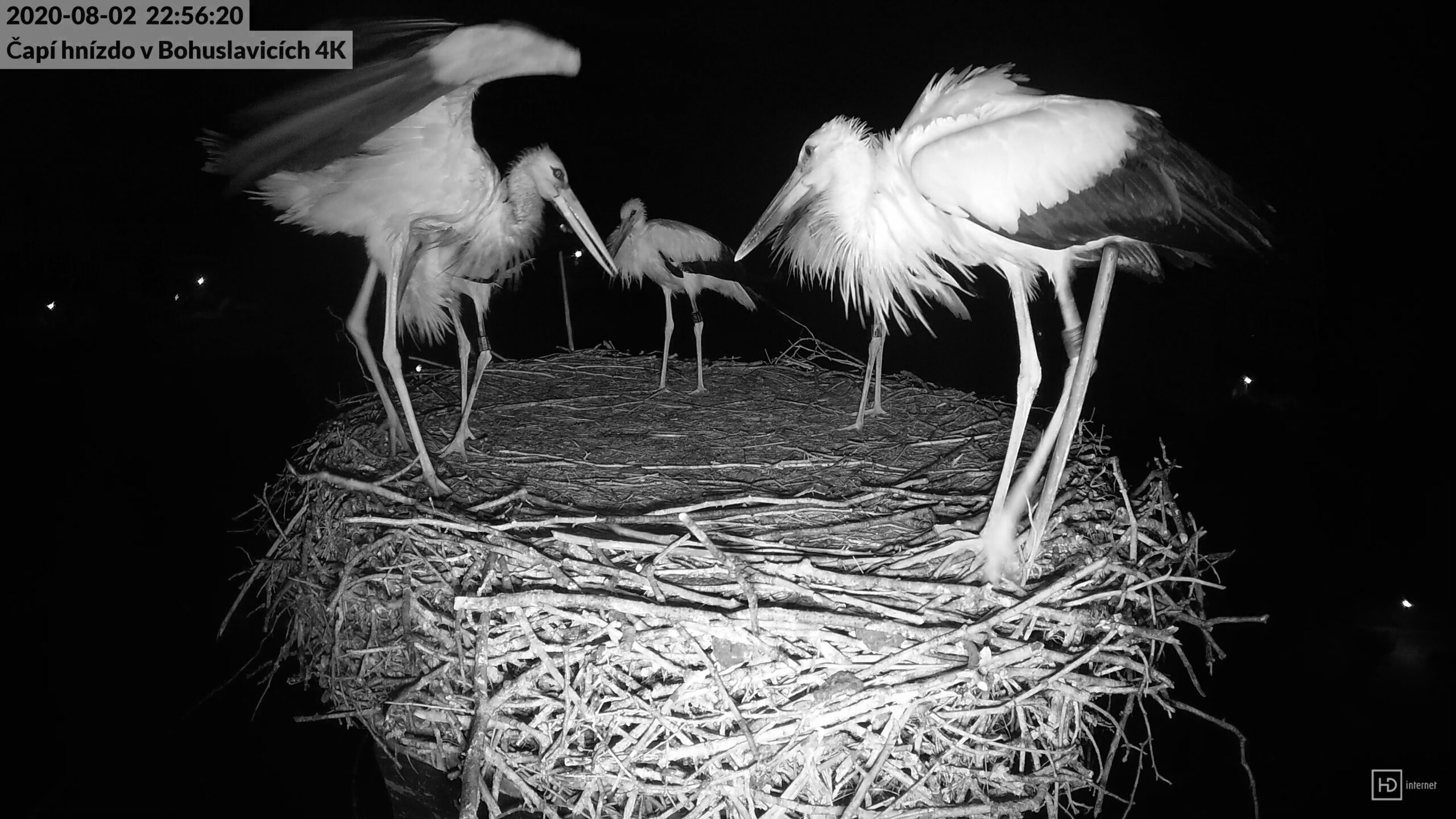 Druhou novinkou byla celonoční nepřítomnost Bohunky na hnízdě. Naposledy opustila hnízdo po večerním krmení v 18:47. Po ní se objevil s večeří Bohouš, avšak v 19:51 taktéž zmizel z hnízda. Mladí zůstali na komíně sami, navíc již začalo slabě pršet. Na krajinu padla tma a rodiče stále nikde. Až ve 22:56 se doma objevil promočený Bohouš. Bohunka zůstala přenocovat někde jinde (možná na střeše pod komínem), a tak mladí strávili deštivou noc pouze s Bohoušem.