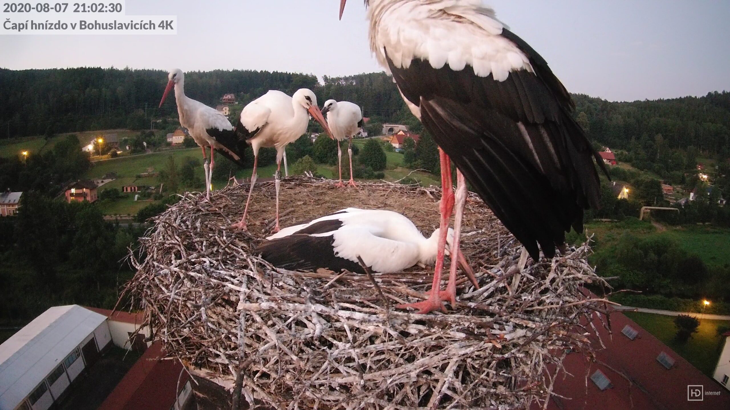 Páteční podvečerní idylka vzala rychle za své při krmení před 21. hodinou. Na hnízdo dorazil jako první Bohouš ve 20:51 a začal servírovat. V průběhu rozdělování stravy dorazila na komín i Bohunka. Nakonec ani ona neodolala hladovému kvičení svého potomstva. Nejvíce hrabošů zvládla okolo 20:55 schramstnout Šárka. A zde bylo pravděpodobně jádro budoucího problému…