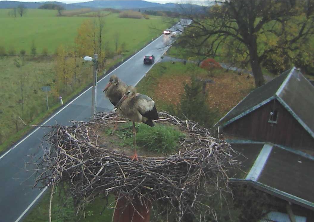 Co jsou zač? Podle zbarvení zobáků se jedná o letošní mladé čápy, nejsou však kroužkovaní. Mohlo by jít o ptáky z Polska (hnízdo leží pár kilometrů od hranice), pozorování z našich hnízd za poslední dva měsíce totiž už nebyla. Možná pochází z hnízda, kde byli mladí vyvedeni velmi pozdě – zbarvení jsou zhruba jako naši čápi při odletu před 2 měsíci. A co s nimi bude dál? Až se zlepší počasí (což by mělo nastat ve středu 4.11.), dají se do pořádku a snad vyrazí dál k jihu. Budeme hnízdo i nadále sledovat.
