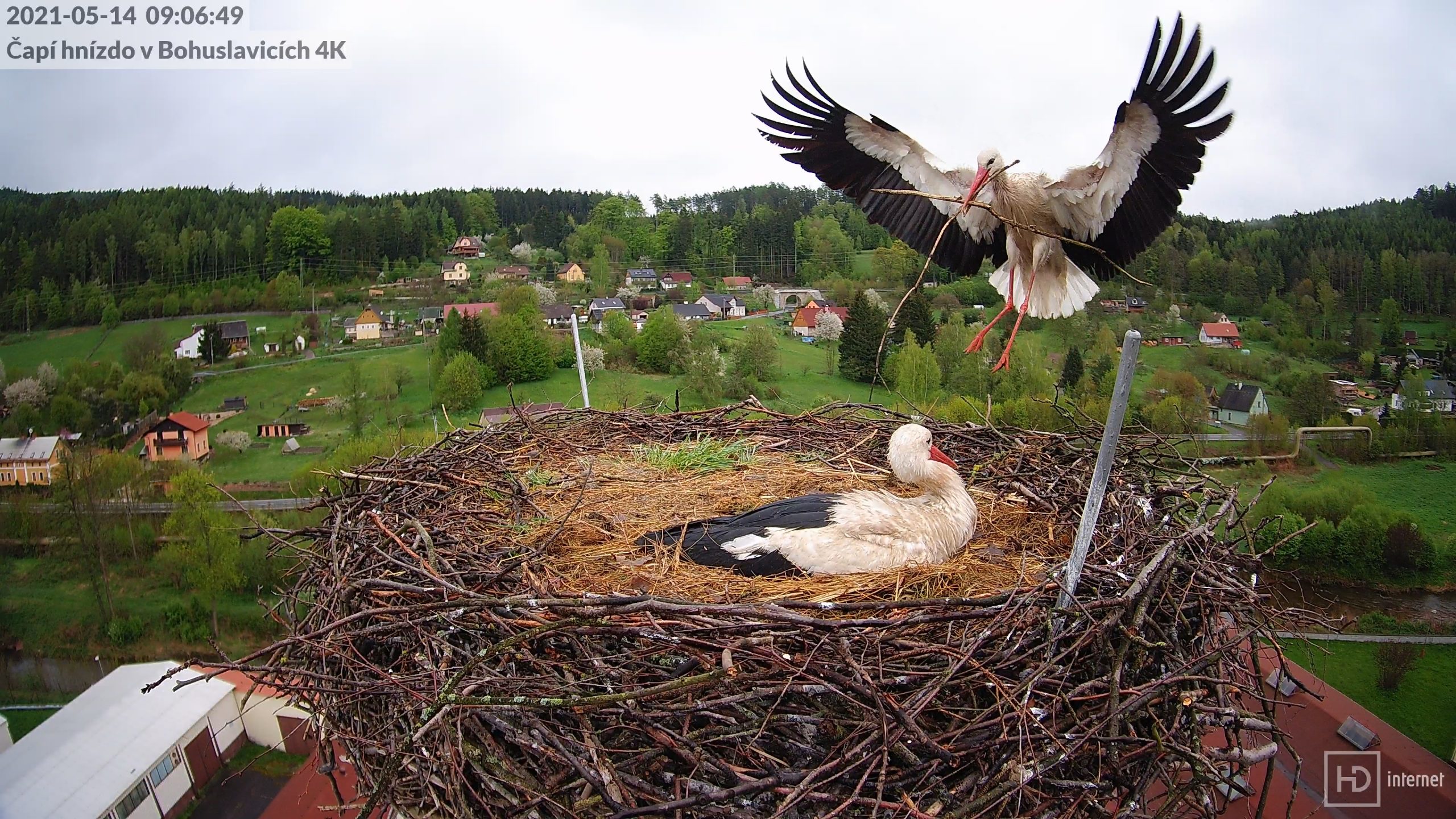 Počasí následujích dní by mělo být spíše vlhčí a chladnější. Denní teploty se budou pohybovat lehce nad +15 °C a každý den nejspíš zaprší. Na klubání čápat by samozřejmě bylo lepší sucho, ale takto zase nebude problémem sehnat drobné krmivo. Podle dění na ostatních hnízdech můžeme čekat první otvor ve vajíčku v neděli večer a vyklubané čápě v pondělí 17. května.