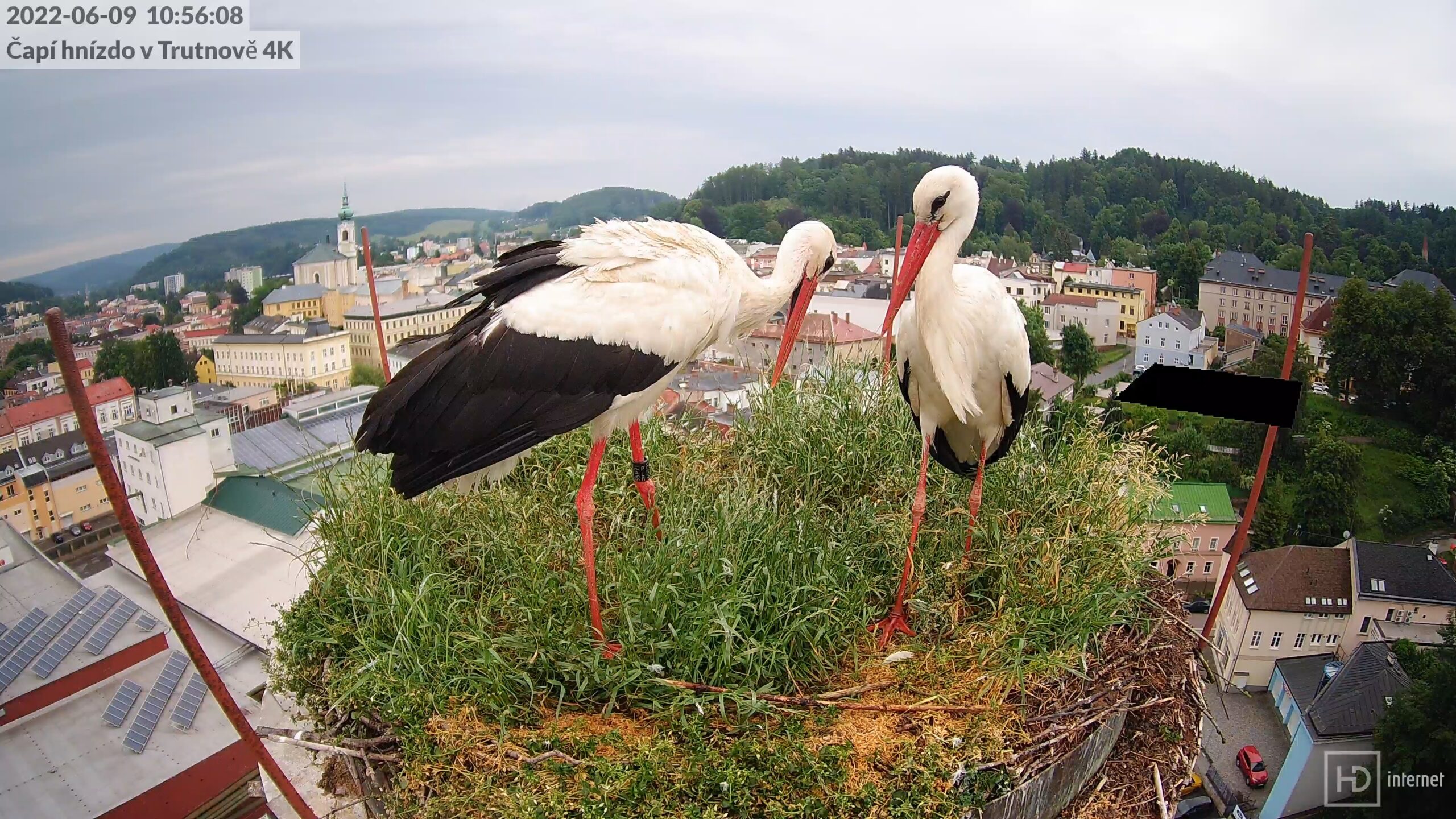 Na Kafkově komíně se zrodil Otesánek. Prostřední čápě alias “Dvojka” je tak nenasytné, že mu nestačilo ani pět myšek od Bohdana. Zkusilo proto sezobnout Bohunčin kroužek a následně i její pařátek. Po jídle sice hezky roste, ale občas na úkor sourozenců. Zdravotní stav “Jedničky” dnes zůstal stejný, kašle spíše méně. Díky obžerství sourozence toho však příliš mnoho nepojedl. Počasí se opět zhoršilo, po většinou dopoledne pršelo. Na pivovarském komíně v Trutnově bylo dnes živo.