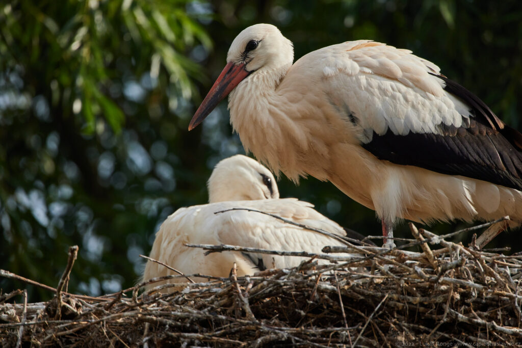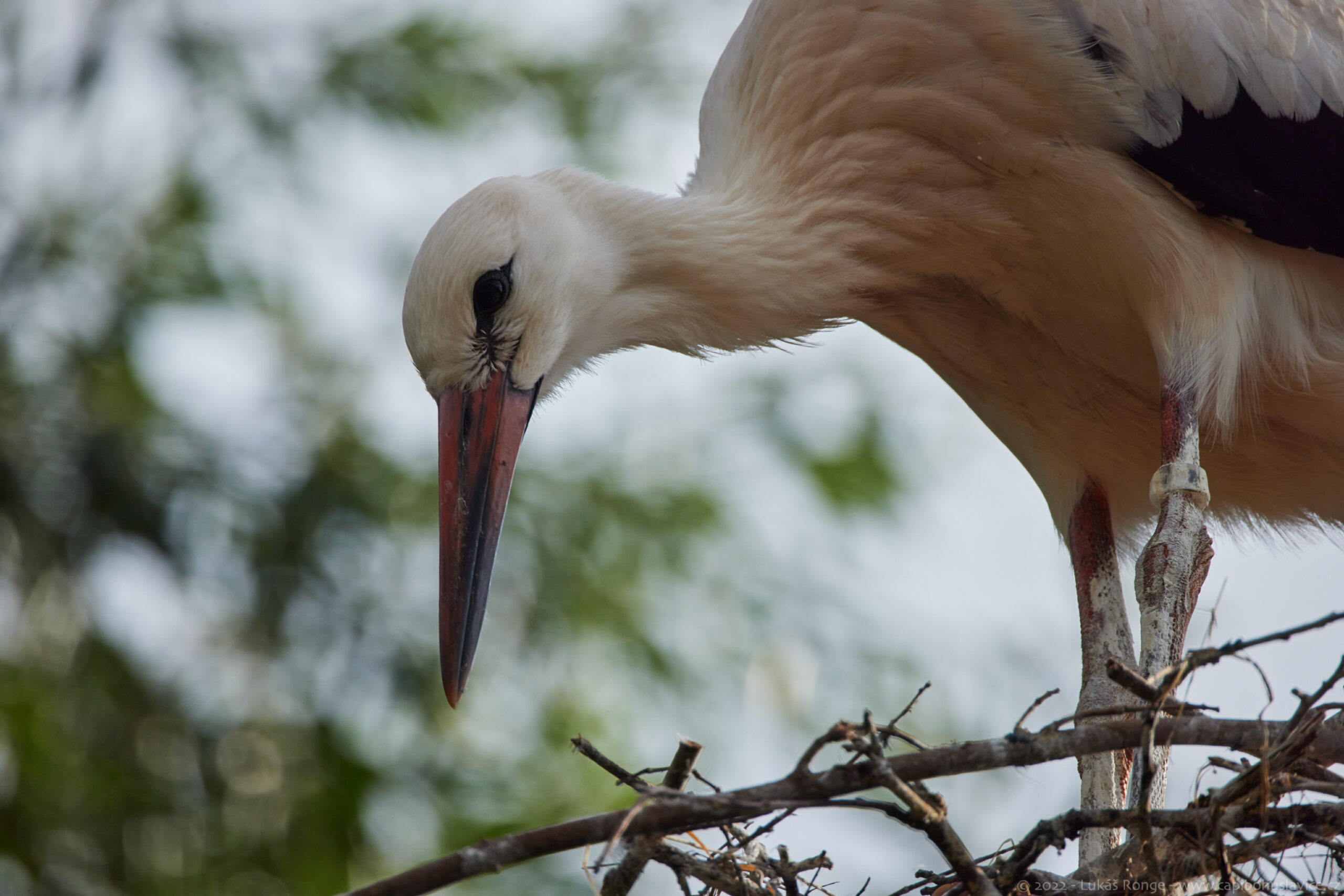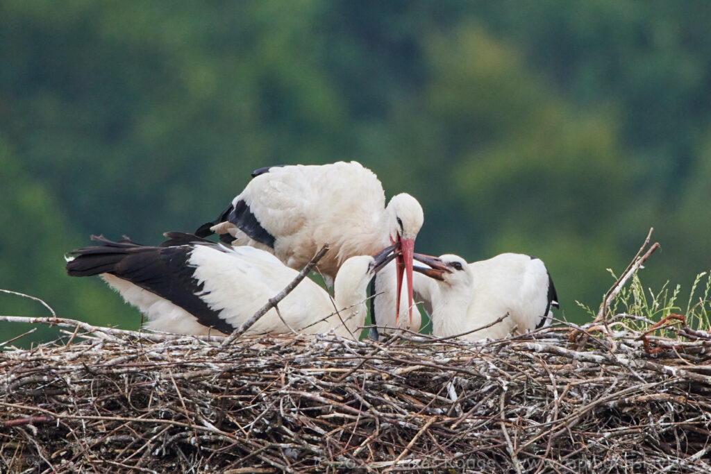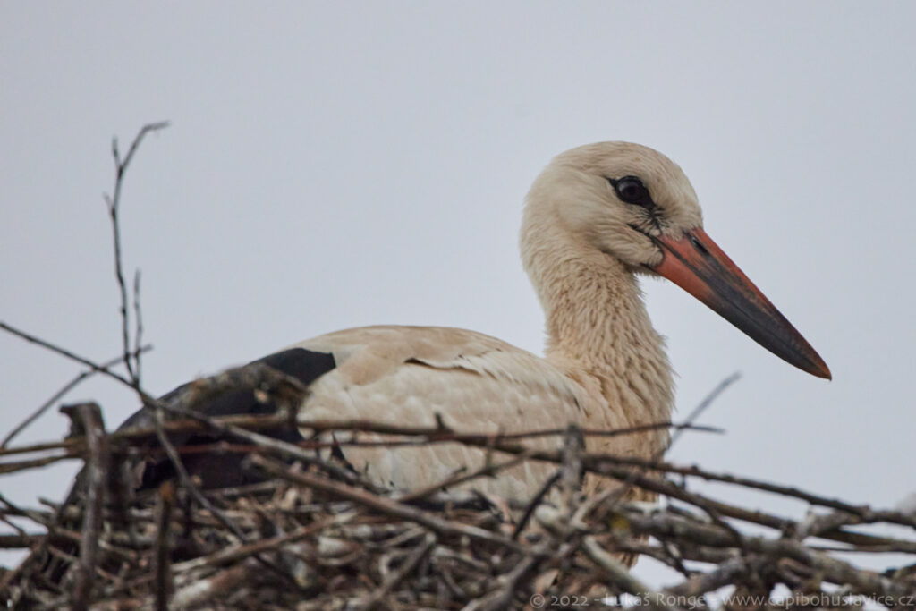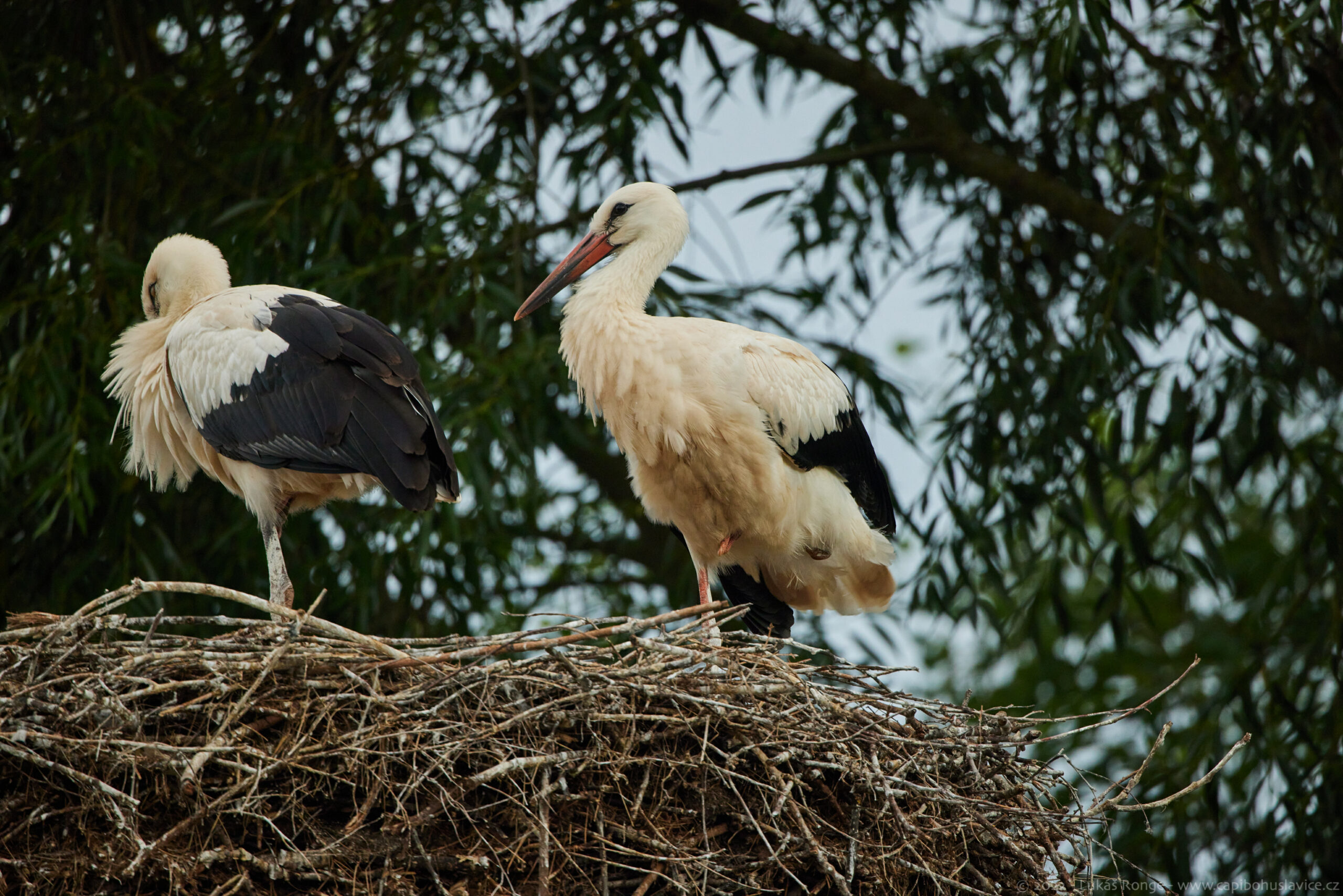 Místo něj jsme ve Stříteži odbočili doleva a přes Staré Buky dojeli do Vlčic. Ještě před příjezdem k samotnému hnízdu jsme na louce narazili na oba rodiče při sběru večeře. Nejednalo se ale o klasické “zetorky”, na louce rostla vysoká tráva. Na hnízdě čekali na jídlo dva mladí čápi. Od místních obyvatel sídlících hned vedle hnízda jsme se dozvěděli, že mládež letos ještě nevyletěla.