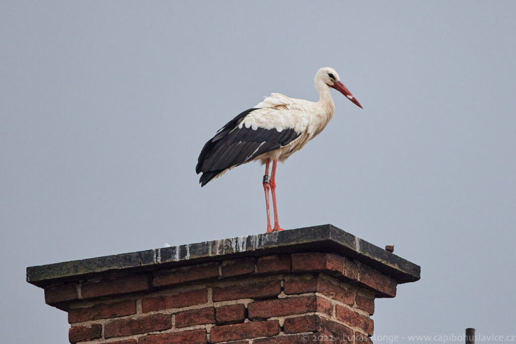 Při příchodu k hnízdu nám nad hlavami kroužil jeden z dospělých čápů. Na komíně jsme zprvu viděli sedět dvě čápata, nakonec se nám ukázala všechna čtyři. Jedno z nich předvedlo tanec i trénink na první let. Zkontrolovali jsem i přilehlou hnízdní podložku, kterou rodiče občas využívají jako letní byt. Byla však prázdná.
