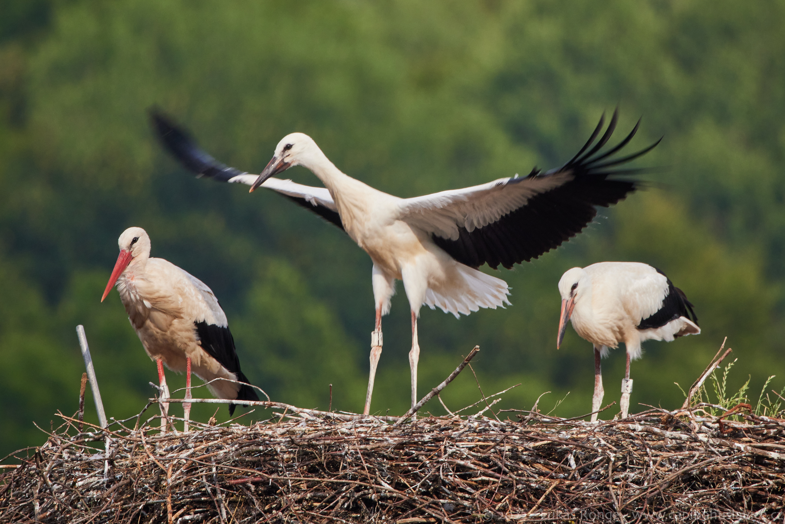 To nejlepší jsme si nechali na konec. Návštěvu našeho domácího hnízda. Vyjeli jsme autem na zalesněný hřbet k nyní již zbořené ruině starého stavení. Po cestě jsme rozehnali fotografující se svatebčany, kteří pořádali oslavu v místní hospodě. Na hnízdo v 18 hodin zrovna přilétla Bohunka a probíhalo krmení, po kterém nám Mahulena předvedla několik povedených výskoků. Při cvičení ji pomáhal i slabý severozápadní vítr. Celkem jsme tedy navštívili 14 hnízd, na kterých jsme napočítali dohromady 24 čápat (na 8 z nich).