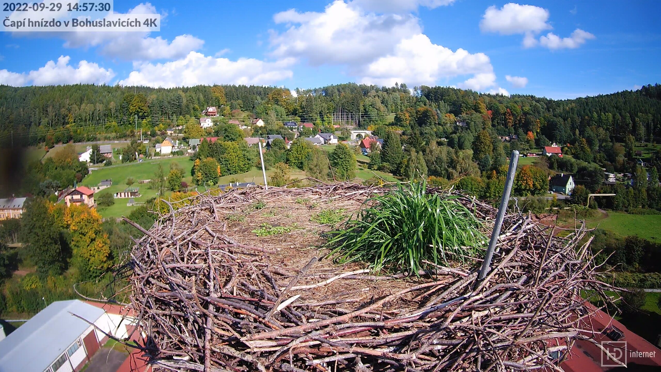 Přesně v polovině září došlo ke zlomu, kdy léto předalo žezlo nastupujícímu podzimu. Výrazně se ochladilo a na hřebenech Krkonoš napadl 18. září první sníh. Na hnízdě ve stejný den pouze pršelo a foukal ostrý severní vítr. Téhož dne večer se začala obloha vyjasňovat a nad komínem se rozklenula výrazná symetrická duha. Oskar ve stejnou chvíli vrhal svůj stín doprostřed hnízda a přes viadukt spěchal do Trutnova rychlík z Prahy. Pokles teplot pokračoval i nadále, a tak jsme se 23. září dočkali prvního ranního mrazu. Podestýlku i travní porost potáhlo šedavým závojem jíní. Za této situace se na komíně objevil pár rehků, kteří dostali jména Berta a David. Rehkové se i poté před kamerou objevovali pravidelně a nejčastěji ze všech ptačích druhů. Pokud jsme je zrovna neviděli, slyšeli jsme alespoň jejich zpěv. V posledních zářijových dnech pak bohuslavický komín zasáhla bouřka s vydatným deštěm.
