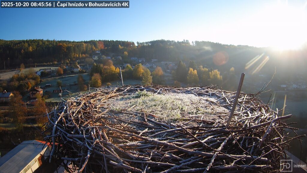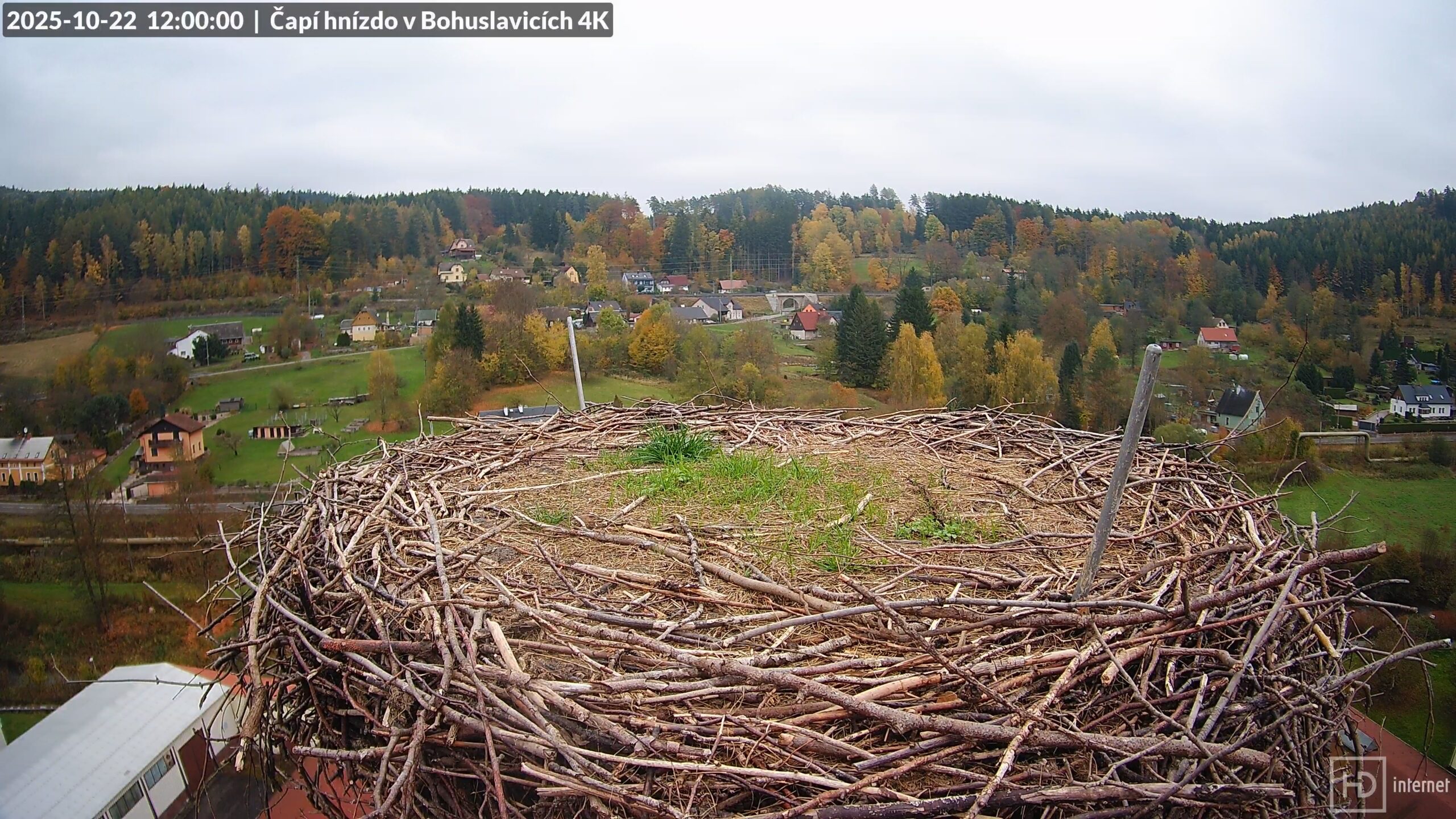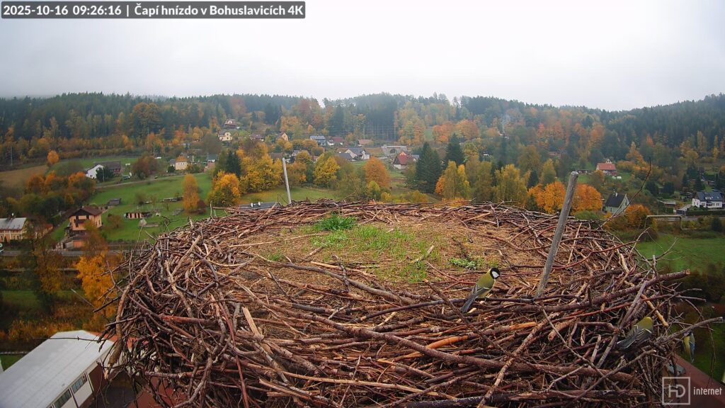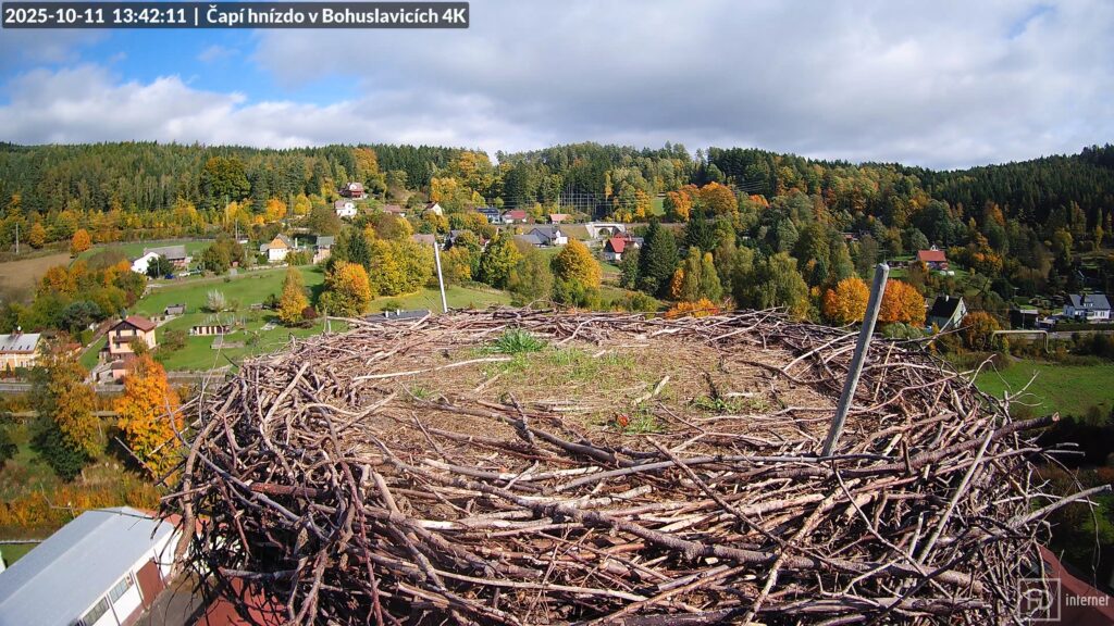 Bohdan s Bohunkou si užívají zaslouženého odpočinku v teple východní Afriky, zatímco se jejich hnízdo pomalu připravuje na příchod zimy. Kafkův komín je čápy opuštěný již dva měsíce, do jejich jarního návratu zbývá odhadem 160 dní. Na našem území zůstává přibližně deset divokých čápů, mezi nimi i Zbojnice. Na hnízdě v Žirči jsme ji mohli naposledy pozorovat 4. října, poté byl přenos přerušen. Znovu bude obnoven až na jaře příštího roku. Před měsícem se ujal vlády podzim a rozhodně nelenil. Letošní počasí odpovídalo roční době a projevilo se i na vzhledu okolí komína. Hnízdo nadále navštěvovali různí ptáci a na pozadí jsme mohli sledovat změny zbarvení krajiny.