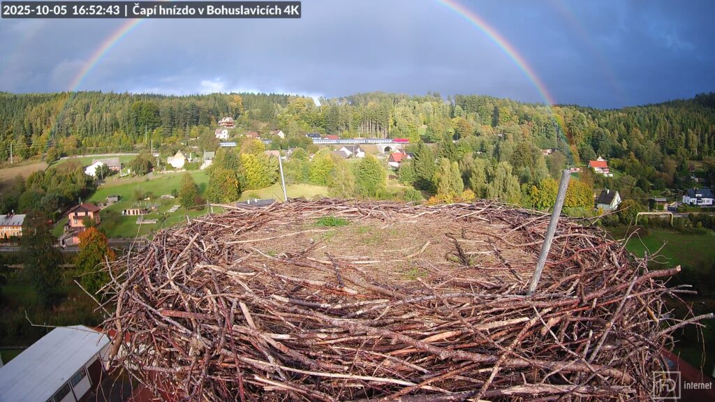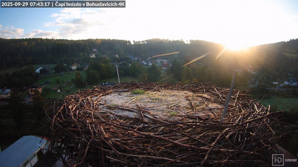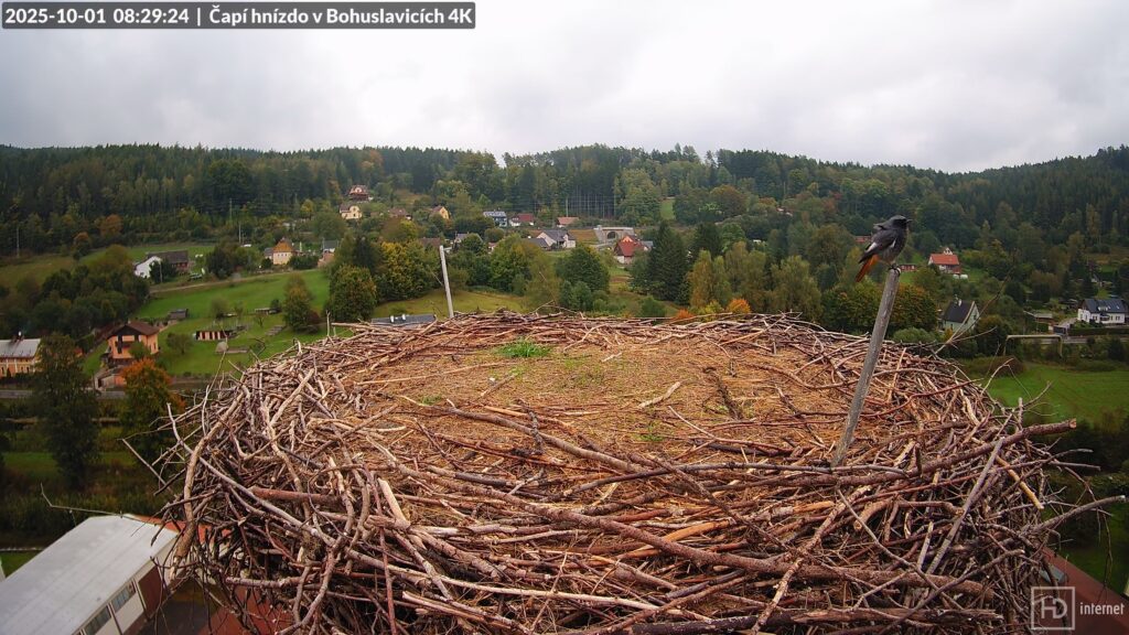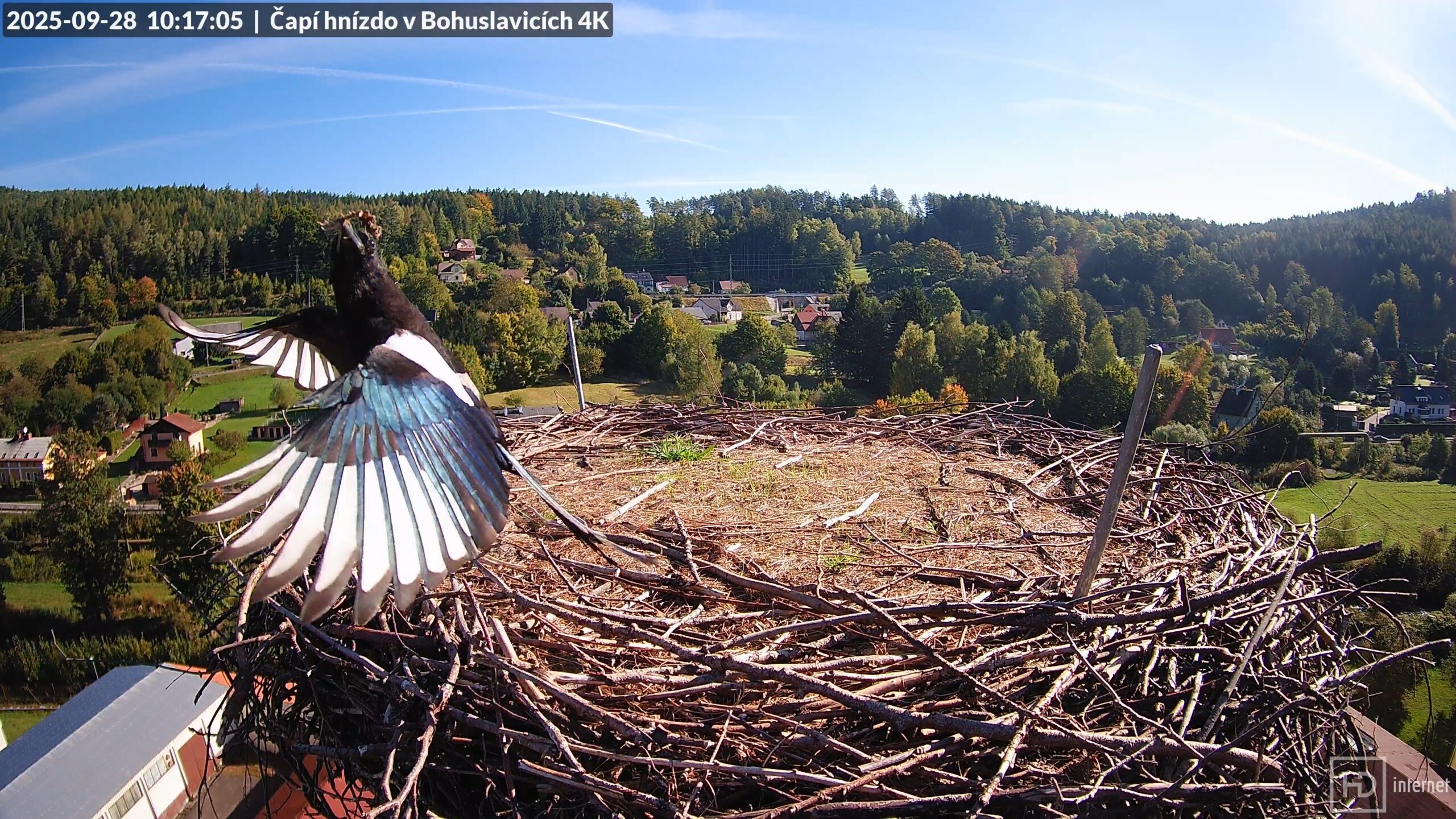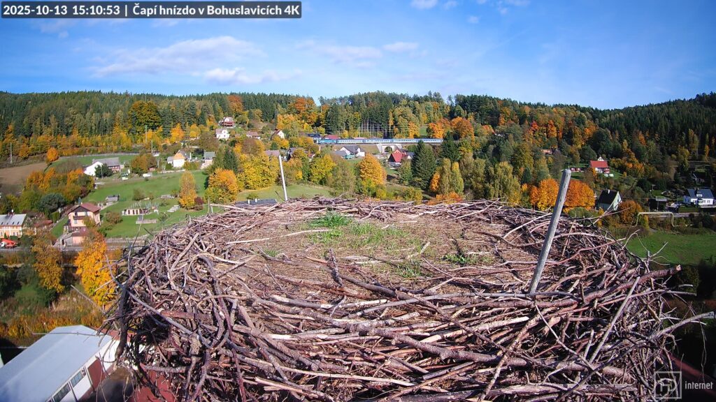 Bohdan s Bohunkou si užívají zaslouženého odpočinku v teple východní Afriky, zatímco se jejich hnízdo pomalu připravuje na příchod zimy. Kafkův komín je čápy opuštěný již dva měsíce, do jejich jarního návratu zbývá odhadem 160 dní. Na našem území zůstává přibližně deset divokých čápů, mezi nimi i Zbojnice. Na hnízdě v Žirči jsme ji mohli naposledy pozorovat 4. října, poté byl přenos přerušen. Znovu bude obnoven až na jaře příštího roku. Před měsícem se ujal vlády podzim a rozhodně nelenil. Letošní počasí odpovídalo roční době a projevilo se i na vzhledu okolí komína. Hnízdo nadále navštěvovali různí ptáci a na pozadí jsme mohli sledovat změny zbarvení krajiny.