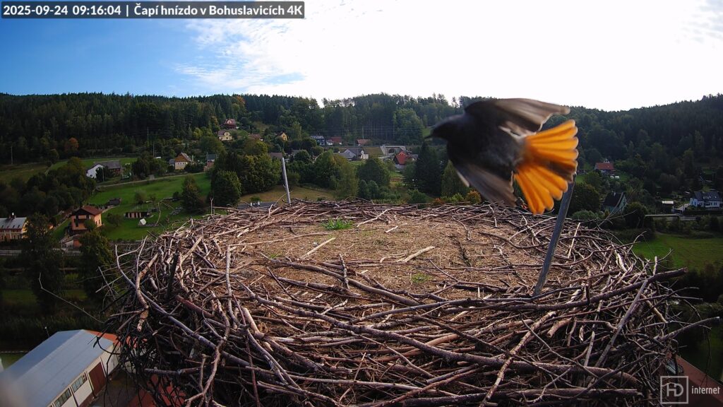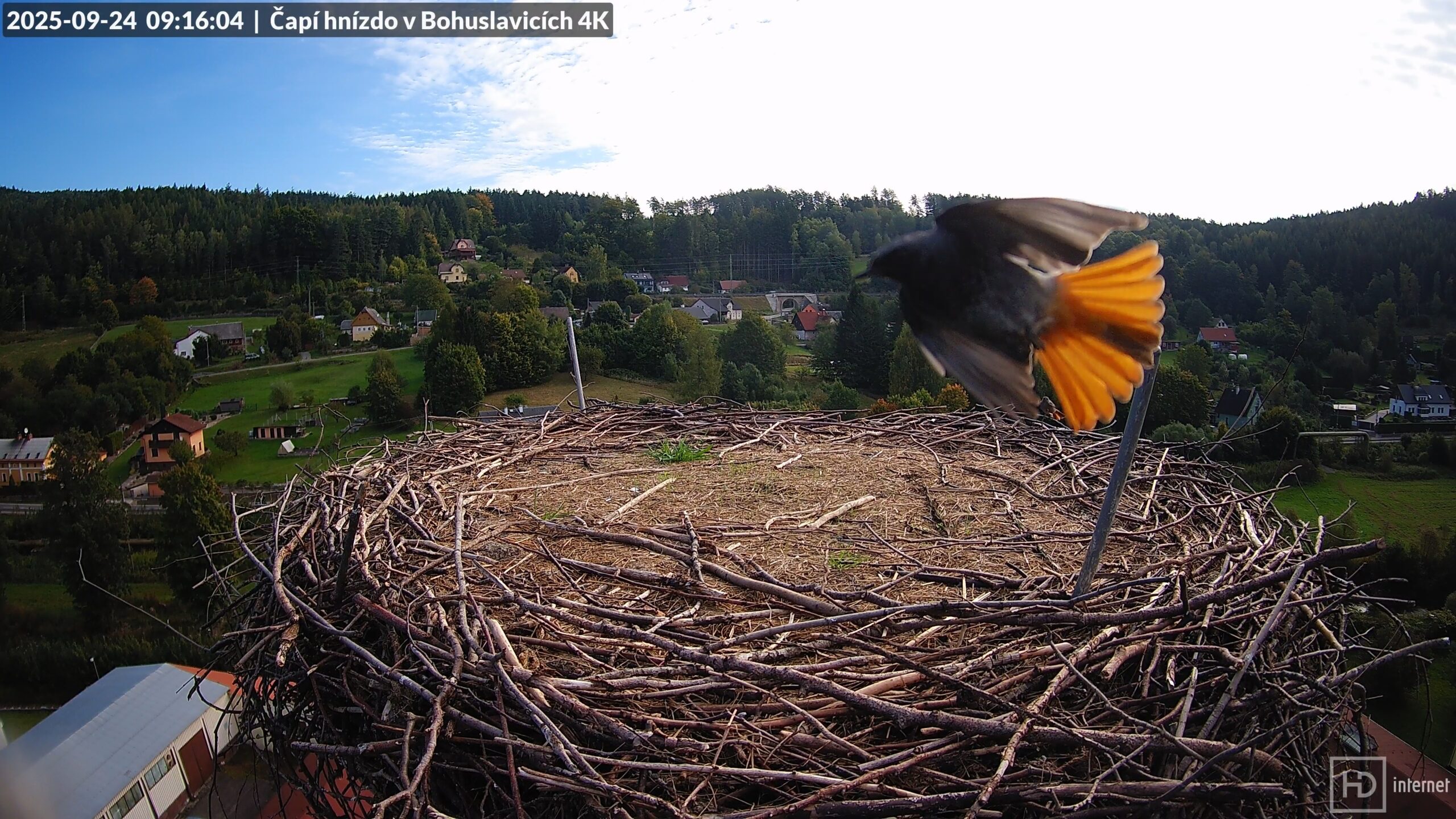 Závěr září se nesl ve znamení chladnějšího a větrného počasí, které však nezabránilo rehkům v pravidelných návštěvách. V noci z 24. na 25. září řádil silný vichr, který polámal a vyvrátil řadu stromů, Bohdanův val však nepoškodil. Růst trávy nadále pokračoval, nízký pažit začal pokrývat většinu hnízdní plochy. Kromě rehků se na komíně objevila také sýkorka, za jasného dopoledne se přímo před kamerou předvedla straka. Poslední zářijové dny přinesly první přízemní mrazíky, 29. září potáhlo povrch hnízda slabé jíní. Ranní přízemní mrazík se opakoval i následujícího dne, po hnízdě se znovu proháněly sýkorky společně s rehky. Na přelomu září a října přenocovala Zbojnice po čtrnácti dnech na hnízdě v Žirči.