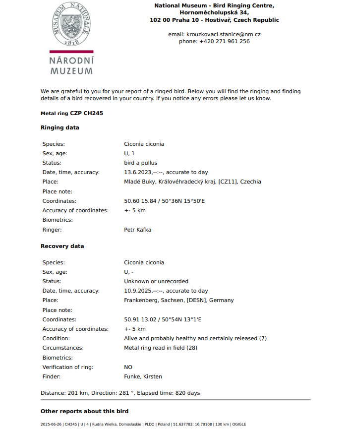 Od Petra Kafky jsme 10. října obdrželi informaci o odečtech mladých čápů ze Slavětína a Žirče. V obou případech se jednalo o tříleté jedince. Čápa z Žirče v srpnu pozorovali na západě Saska u obce Meinsdorf. Slavětínského mladíka odečetli němečtí vědci na jeho tahu k jihu v Bulharsku. Nacházel se nedaleko černomořského pobřeží u města Burgas, v blízkosti obce Bratovo. Včera pak dorazil odečtový list mladobuckého Athose s kroužkem CZP CH245. Ten byl spatřen již v červnu na skládce poblíž obce Rudna Wielka, odkud se přesunul dále k západu a 10. září se pohyboval v Sasku poblíž Frankenbergu.