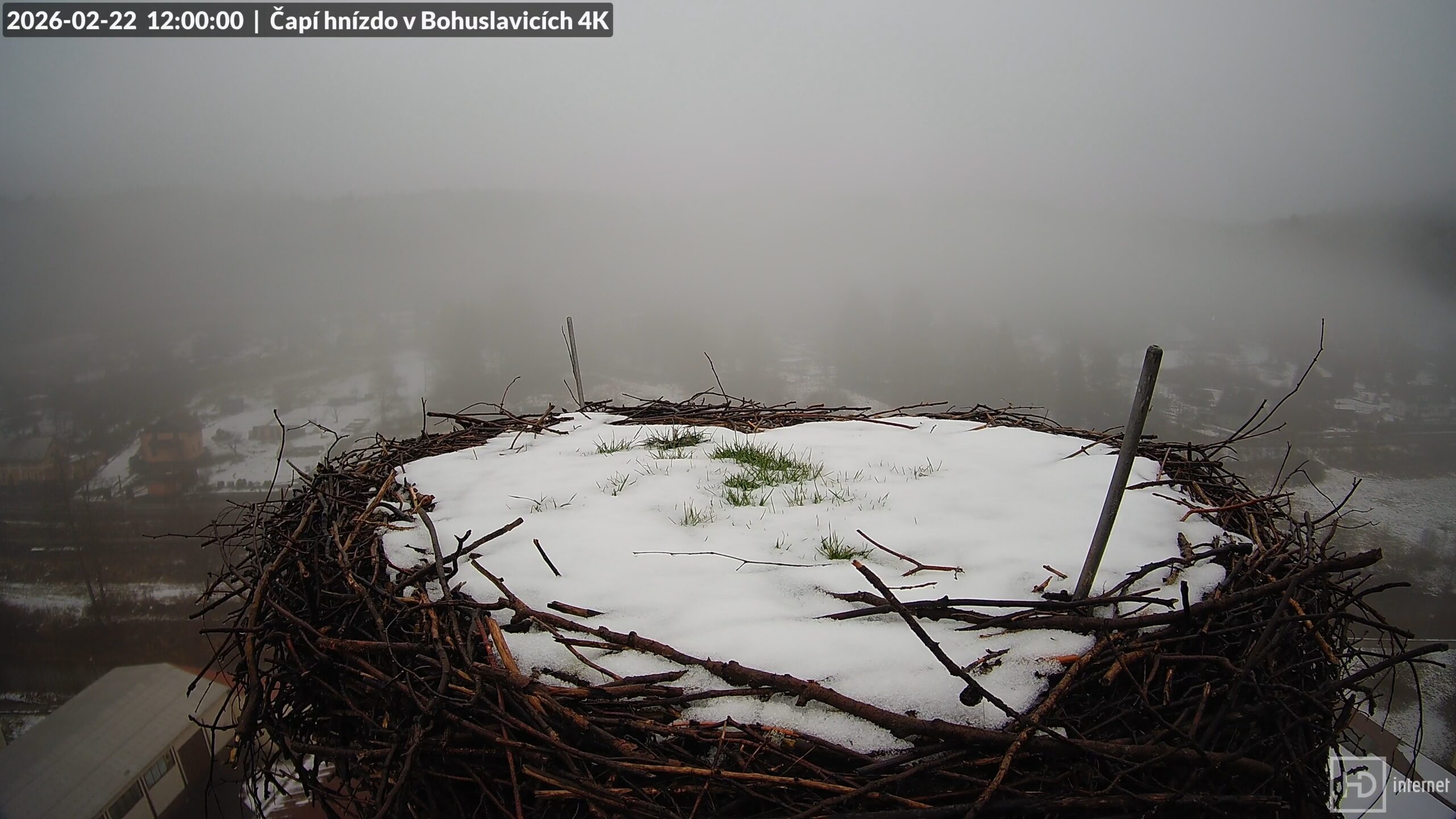 Po odkrytém Bohdanovu valu poskakovala sýkorka, týž den pocukroval hnízdo nový sněhový poprašek. Nevydržel ale příliš dlouho, 12. února bylo hnízdo zcela holé a teplota vystoupila k +8 °C. Zima však rozhodně neřekla poslední slovo a vrchol komína záhy opět zbělal. Nastaly i výraznější mrazy, při kterých noční teploty klesaly až k -10 °C. Těsně před zlomem k trvalejšímu oteplení jsme 20. února zaznamenali nejmrazivější noc tohoto měsíce. Při následní oblevě vytrvale pršelo a okolí komína opakovaně skrývala hustá mlha. Bílou peřinou znovu pozvolna začíná prorážet tráva, která je v letošním roce znovu spíše nízká.