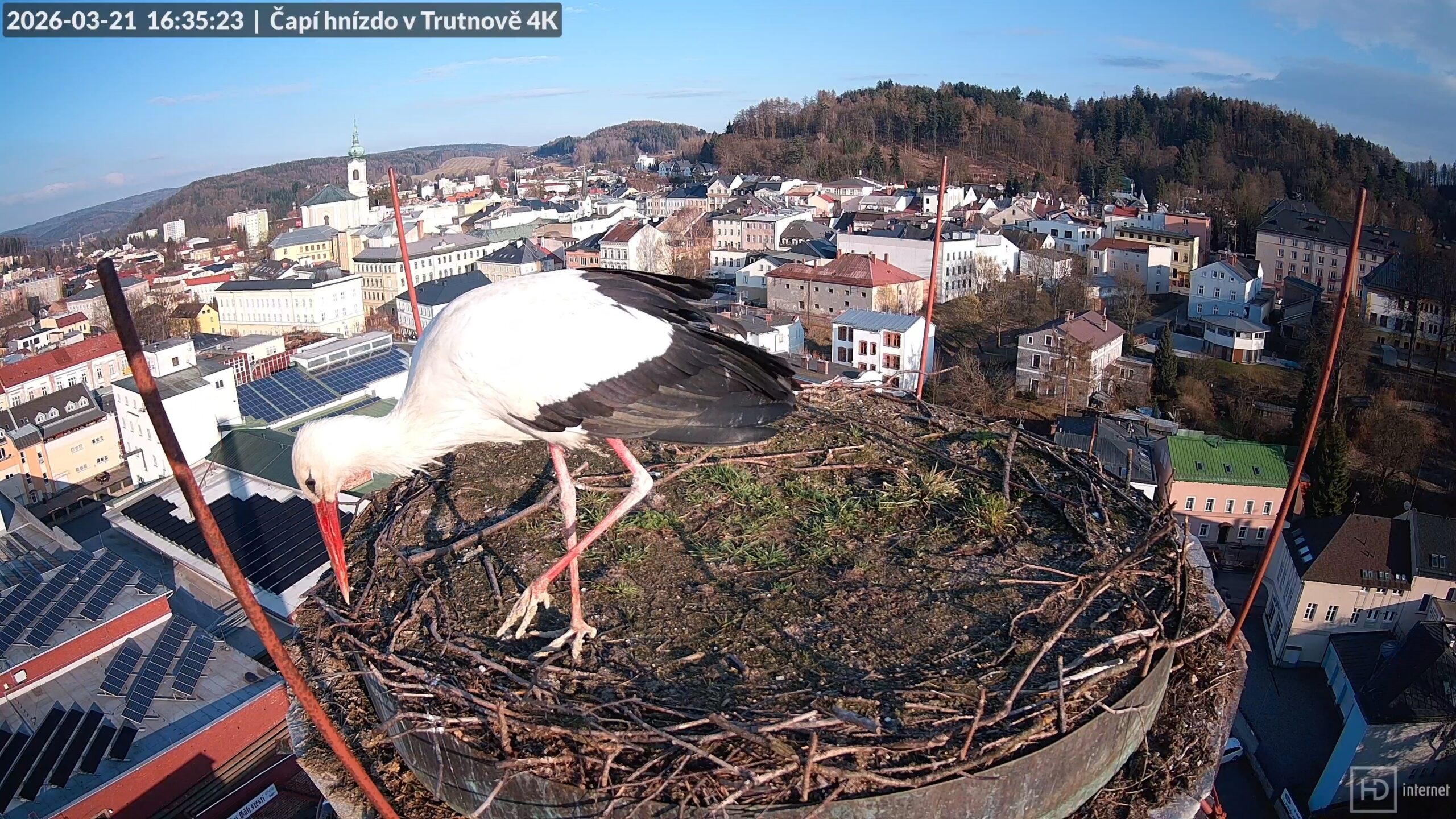 První čápem, který v letošním roce navštívil hnízdo nad pivovarem Krakonoš, byla již před jedenácti dny Puntička. O den později strávila na komíně noc, načež se přesunula do Bohuslavic. Trvale se na tamějším Kafkově komíně usadila až po návratu Bohdana. Mezitím na zdejší hnízdo žádný další čáp nezavítal, takže se opět stalo doménou strak a poštolek. Čapí bezvládí skončilo až dnes odpoledne, kdy se objevil další černobílý uchazeč o trůn.