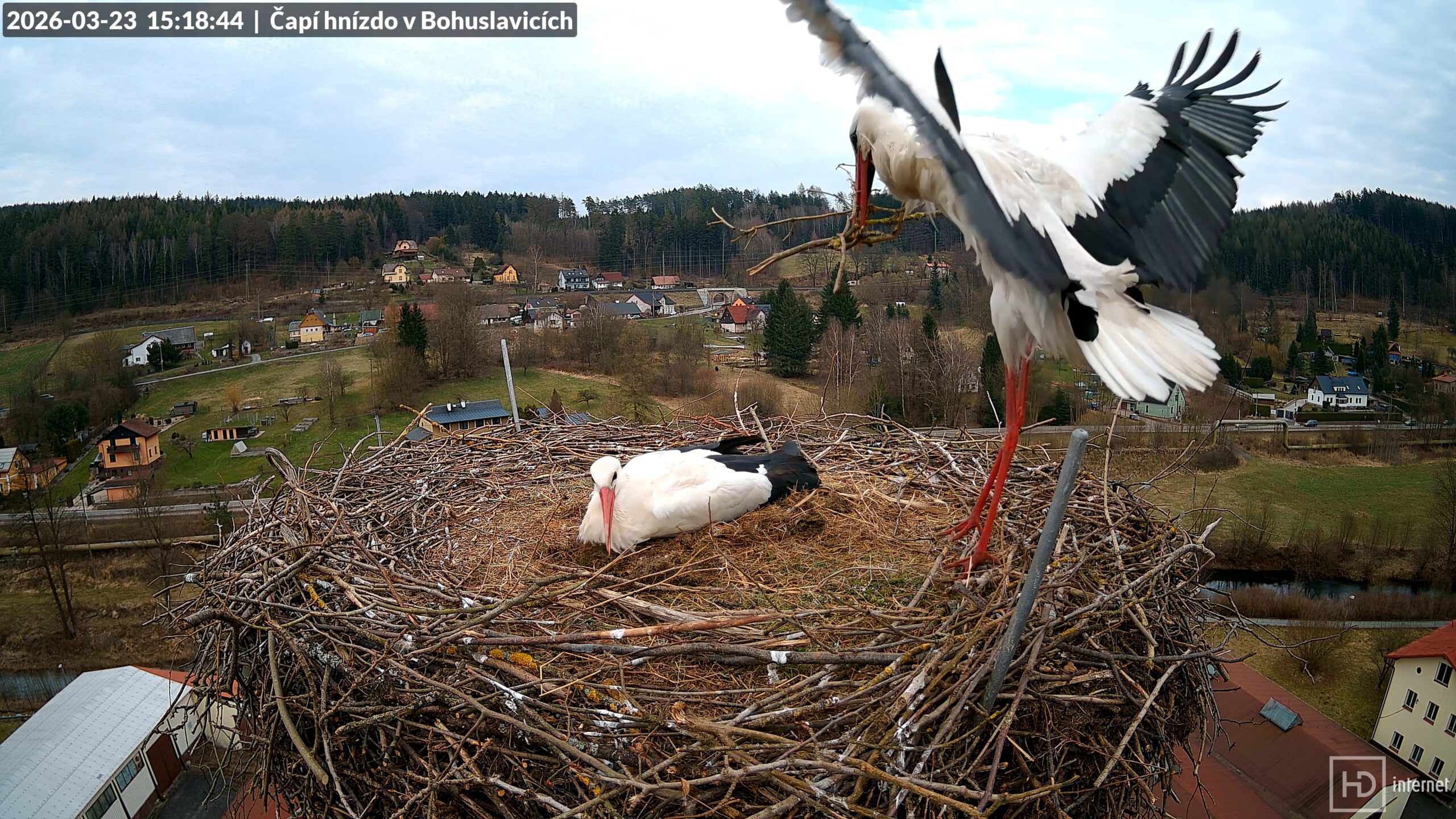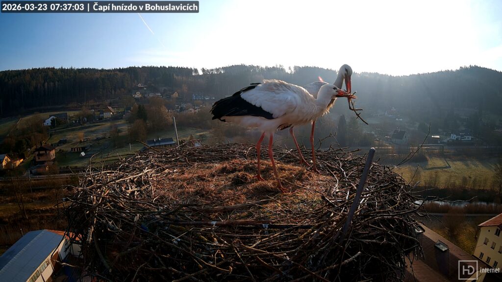 Čápů v našem okolí dnes opět přibylo, někde se situace zkomplikovala, jinde naopak vyjasnila. Na hnízdě v Královci již hospodaří kompletní pár, k osamělé paní domácí se Vrchlabí se přidal potulný samec z Roztok u Jilemnice. Ve večerních hodinách se v Ústí nad Orlicí dočkala Uršula Ulricha. Ten si nebral žádné servítky a konkurenta nemilosrdně vyhnal ze svého hnízda. Magda zatím zůstává v Trutnově sama, stejně jako se nezměnily poměry na Kafkově komíně. Až zítra se otevírá standardní příletové okno Bohunky, každý den tak nyní může přinést překvapivou změnu.