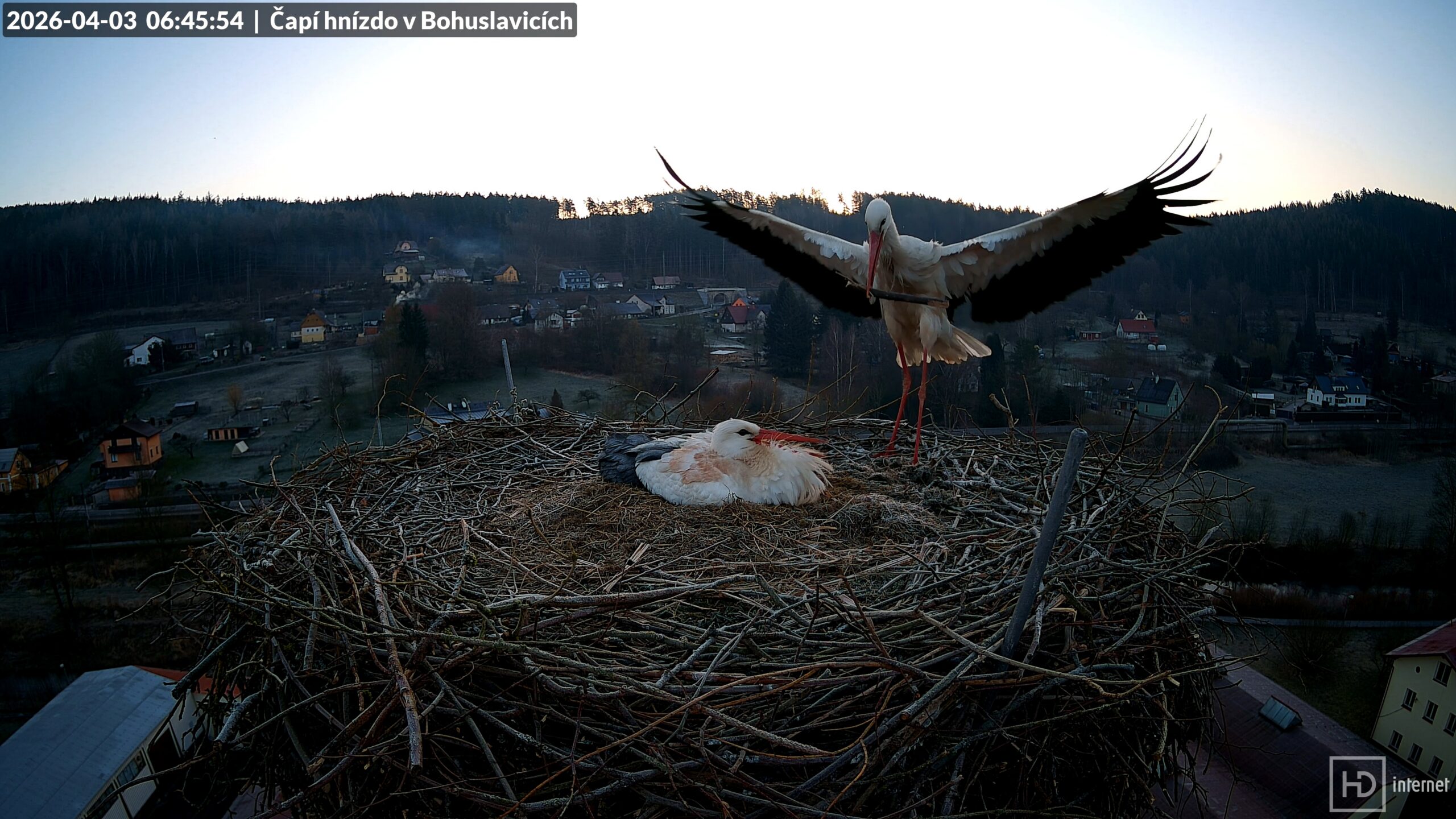 Bohdan zahájil pracovní činnost v 6:32, na hnízdo si donesl dřevěný doutník. Puntička se po vystřídání nad vajíčky vydala na snídani v 6:54. Po východu slunce se obloha rychle zatáhla, po většinu dne zůstalo pod mrakem. Odpolední teplota se pak pohybovala okolo +13 °C. Zbytek rána zasvětili čápi práci, na komíně opět přibylo stelivo i rákosí. Bohdan opakovaně zalétal pro materiál pod horní silnici. Hodinu před polednem proběhlo krátké zastrašování, Bohdan se pak téměř dvě hodiny povaloval na hnízdě sám. Puntička si užívala let ve výšce, mohli jsme ji pozorovat, kterak dlouhou dobu kroužila vysoko nad lesem. Idylka však měla záhy skončit, k hnízdu totiž nezadržitelně směřoval čáp s kroužkem DEH H9931…