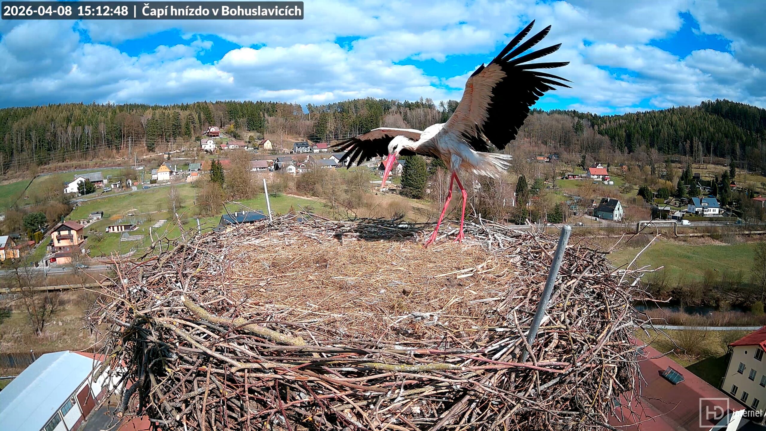 Po poledni si zalétla Bohunka na hadí loučku, Bohdan si ji později přivedl s sebou zpět. Vítr nadále sílil, jeho nárazy začaly kypřit Bohdanův val. Bohunka z něj vypáčila tu nejsilnější větev a přenesla ji přímo před kameru. Další silný poryv vichru nadzvedl i toto mohutné poleno. Teplota pozvolna klesala z poledního maxima okolo +13 °C, a to i přes téměř bezoblačnou oblohu a vydatný sluneční svit. Odpoledne a večer se na hnízdě nepřihodilo nic zajímavého, čápi střídavě opouštěli komín, Bohdan si zaplachtil nad lesem. Občas zůstal prostor před kamerou prázdný, Bohunka se opět vydatně vykrmovala. Úterní dění uzavřel společný přílet na komín v 19:33. Vítr s nastupující nocí dočasně utichl, čápi zůstali stát a nerušeně pospávali. Jen Bohdan provozoval v pravidelných intervalech akrobacii na Bohunčiných zádech.