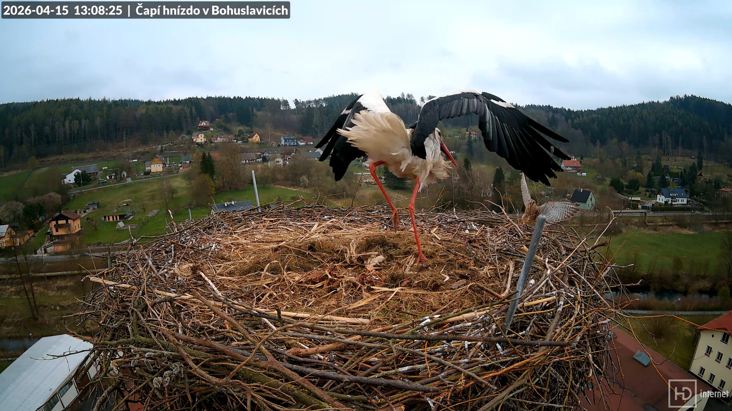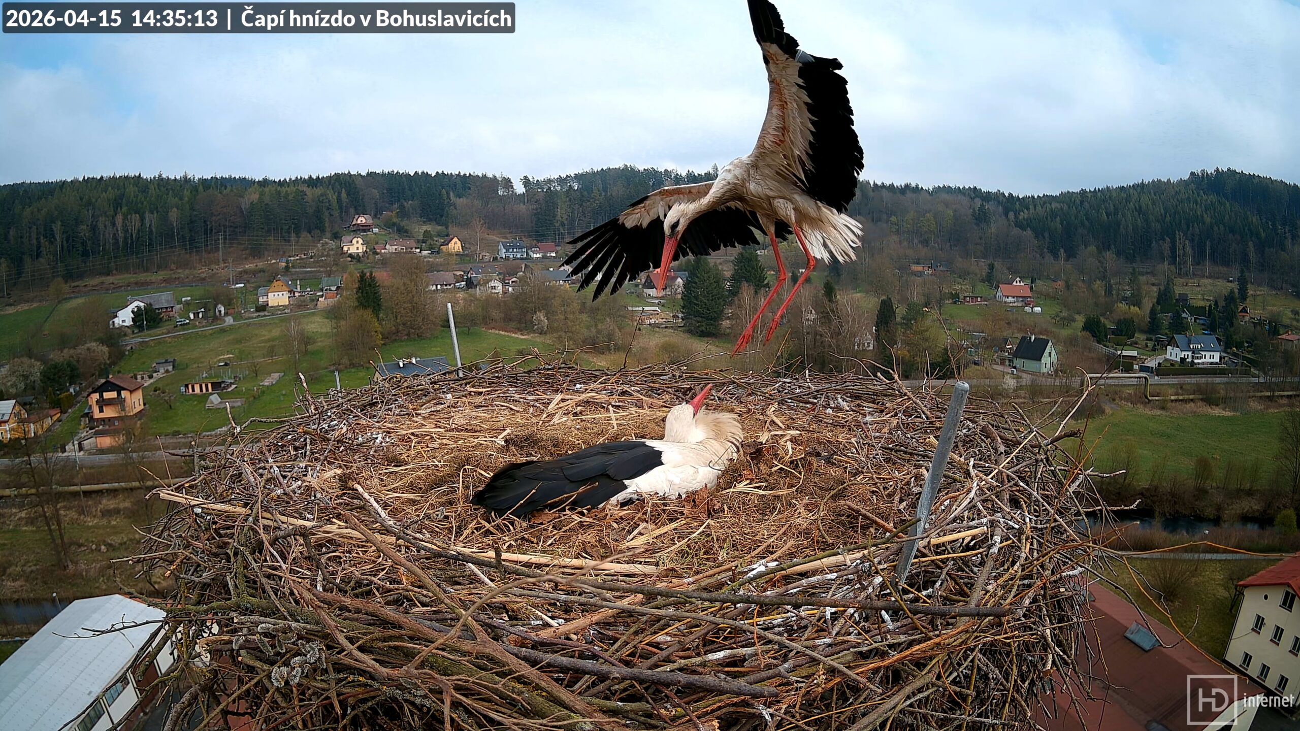 Noc na středu i většina tohoto dne se nesla ve znamení zatažené oblohy, ranní teplota se znovu pohybovala okolo +5 °C. Bohdan s Bohunkou se pravidelně střídali v sezení, Bohunka odlétla na ranní lov již v 5:33. Po jejím návratu zahájil Bohdan svou pracovní směnu, přinášel na hnízdo větve i stelivo, Bohunka mu občas pomáhala s uložením materiálu. Při těchto aktivitách si vydatně ušpinil hlavu a krk. Okolo komína opakovaně kroužila neodbytná poštolka. Nakonec Bohdana vyprovokovala k obrannému zákroku, po kterém ji i nadále pozorně sledoval. Později odpoledne se Bohdan zalétl vykoupat do řeky a delší dobu se pak na komíně sušil. Na chvíli vysvitlo slunce a teplota se tak přiblížila k +14 °C. Ani k večeru ho Bohunka na vajíčka nepustila, odlétl proto pro něco dobrého na zub.