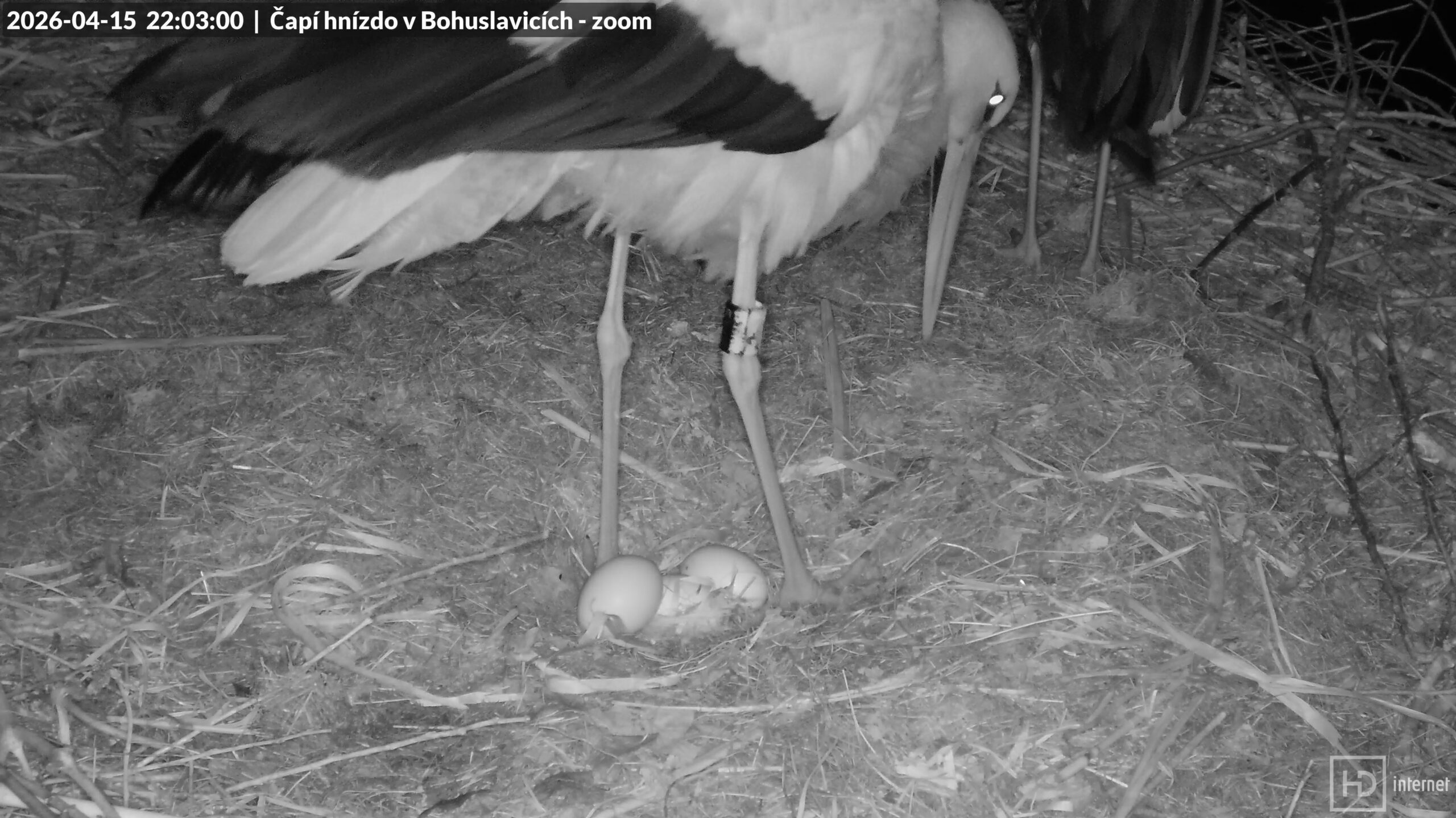Přesně v 18:00 zvedl Bohunku stiskem tlačítka a uvelebil se v důlku. Dlouho tam ale nepobyl, o hodinu později již rovnal masivní větve ve valu a později odlétl z komína pryč. S dlouhým prutem v zobáku přilétl v 19:47. Kupodivu se ani příliš nedobýval na kanape, tentokrát měla Bohunka vcelku klid. Tedy až na Bohdanův výskok na záda těsně před snesením třetího vajíčka. Jeho příchod na svět signalizovalo vydatné špikování podestýlky, točení se nad důlkem a úklid okolo vajíček. Pak již šlo vše ráz na ráz, ve 21:58:50 bylo vajíčko venku a hned ve 22:03:00 se s ním Bohunka pochlubila. Ani poté se Bohdan příliš neměl k otcovským povinnostem a zabýval se raději peříčkúrou.