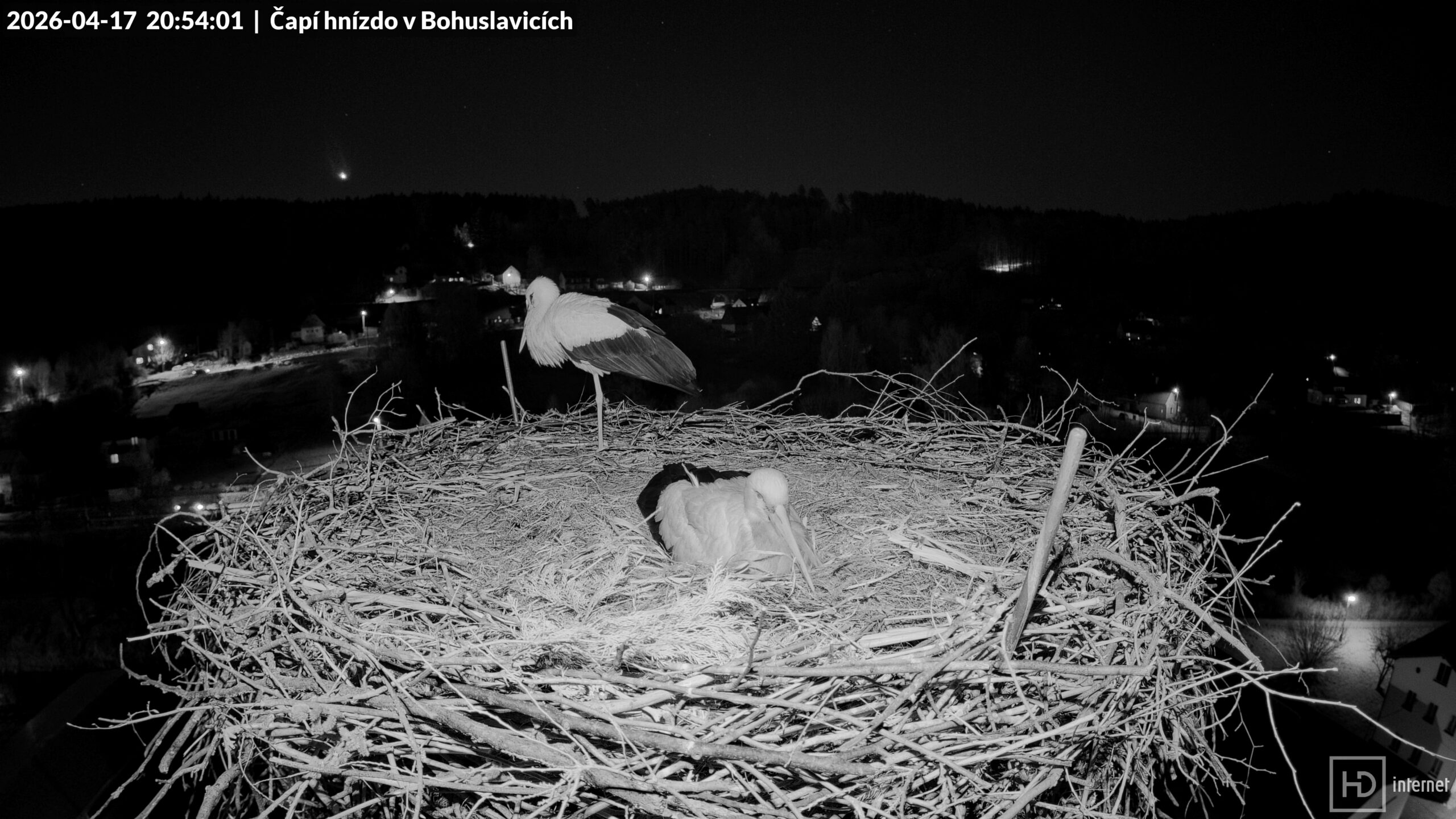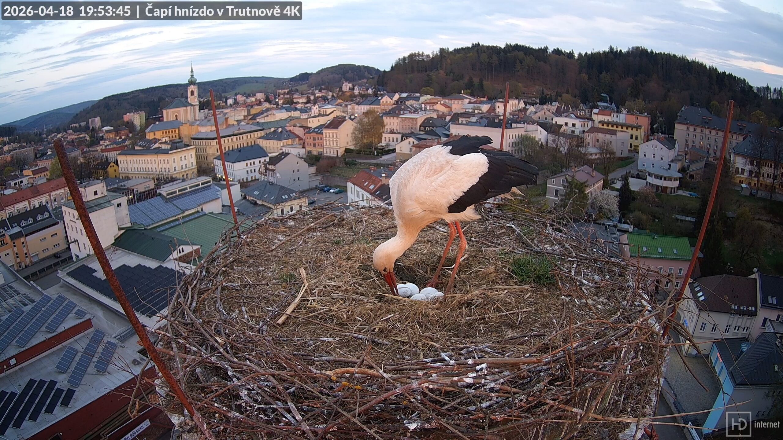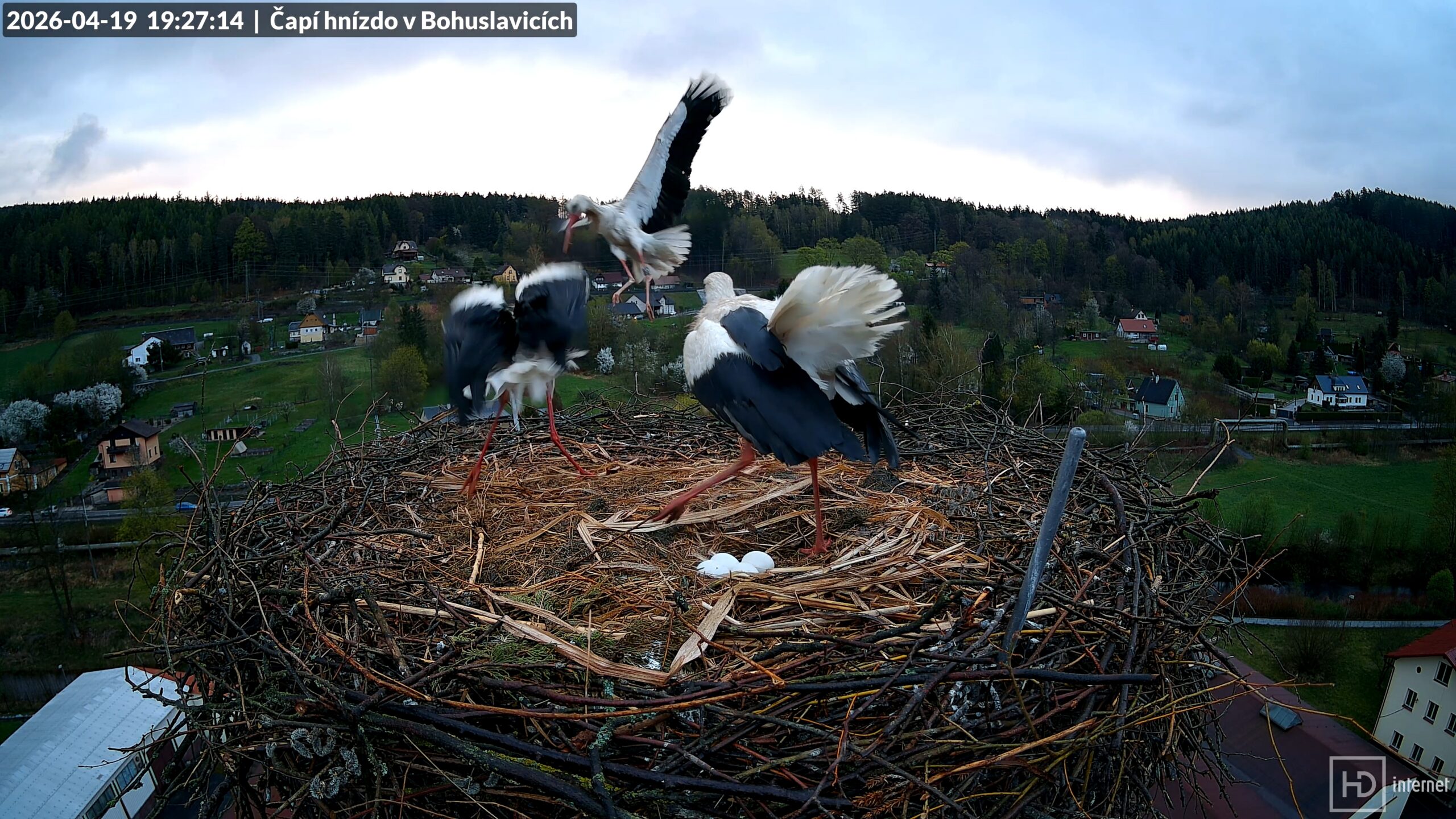 Déšť konečně ustal po 19. hodině, chvíli poté na hnízdo měkce dosedl Bohdan s dlouhou větví. V závanu větru si poskočil, na což ležící Bohunka reagovala pochvalným zaklapáním. Večerní pohodu narušil přílet cizího čápa s nečitelným ELSA kroužkem na levé noze, který se s klapáním blížil ke komínu. Střet s obránci ale riskovat nemínil, takže pokus o přistání spěšně přerušil. Následovala opakovaná honička s Bohdanem v okolí komína a ještě jeden průlet pod hnízdem. Bohdan se definitivně vrátil v 19:38 a úspěšné zahnání narušitele oslavil několikerým poskočením ve větru. Bohunka ho nechala zalehnout do důlku a pustila se peříčkúry. Ačkoliv později Bohdana vystřídala a začala špikovat své okolí, ke snesení pátého vajíčka se nejspíš nechystala.