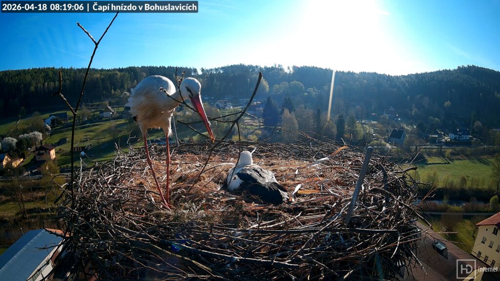 Jak jsem již zmínil v předchozí reportáži, čtvrté vajíčko snesla Bohunka v pátek nečekaně brzy a v Bohdanově nepřítomnosti. Záhy po svém příletu se Bohdan ujal svých povinností, vajíčka přepočítal a zalehnul na ně. Ve 20:54 prozářil oblohu nad hnízdem velmi jasný bolid, rychle zapadající za les. Oba čapí rodiče se v noci střídali v zahřívání, za jasné oblohy klesla ranní teplota slabě pod bod mrazu. Bohunka vyrazila na časnou sobotní snídani v 5:22, lovem strávila hodinu a po návratu neváhala použít Bohdanovo tlačítko. Bohdan se lehce upravil, odlétl v 7:21 pro rákos a poté se dále zkrášloval v paprscích ranního slunce.
