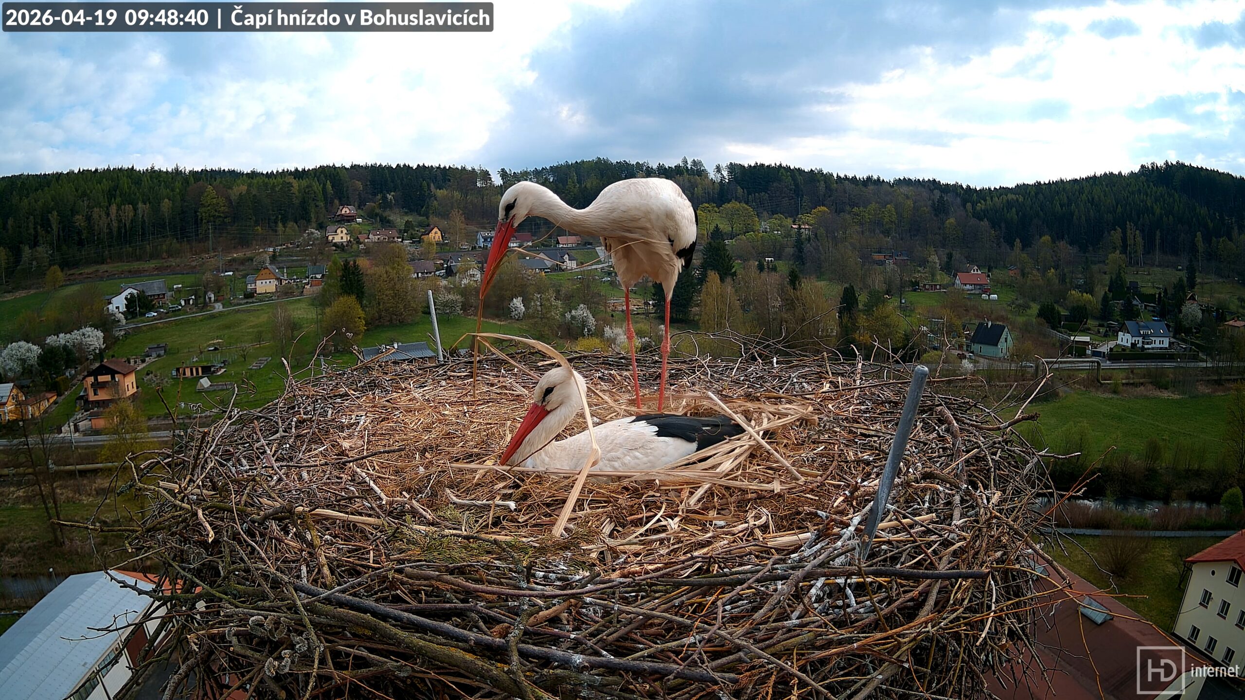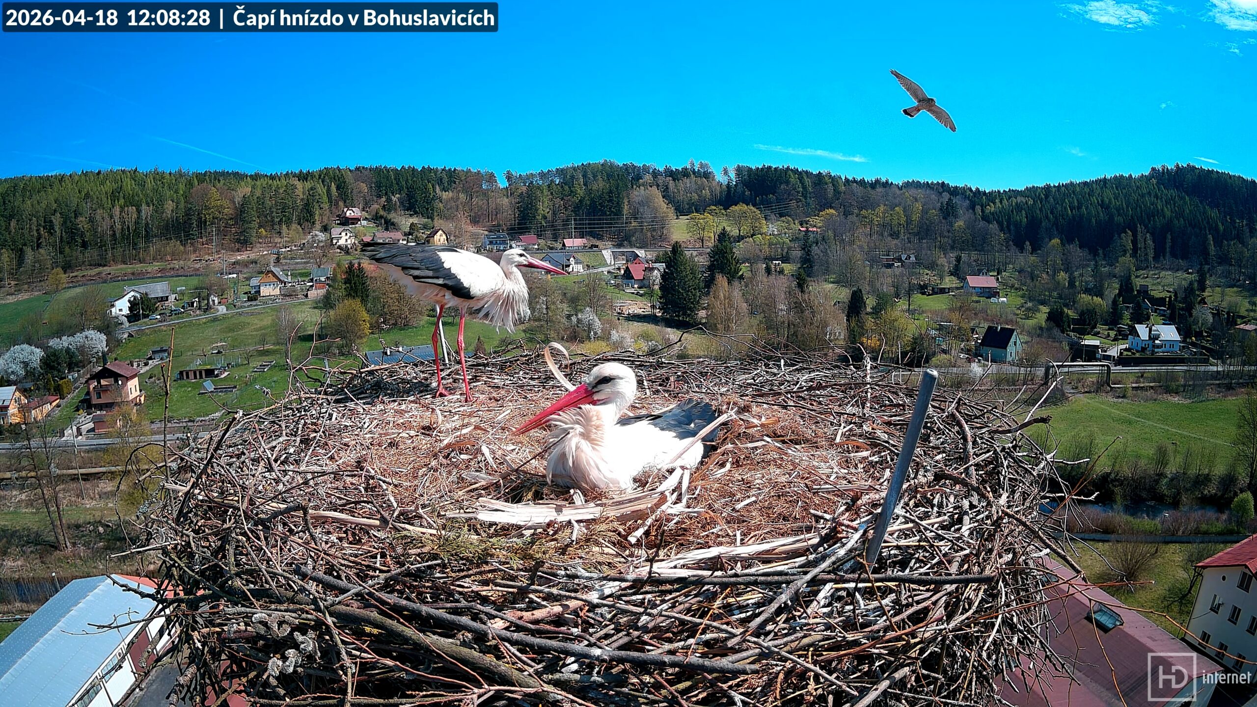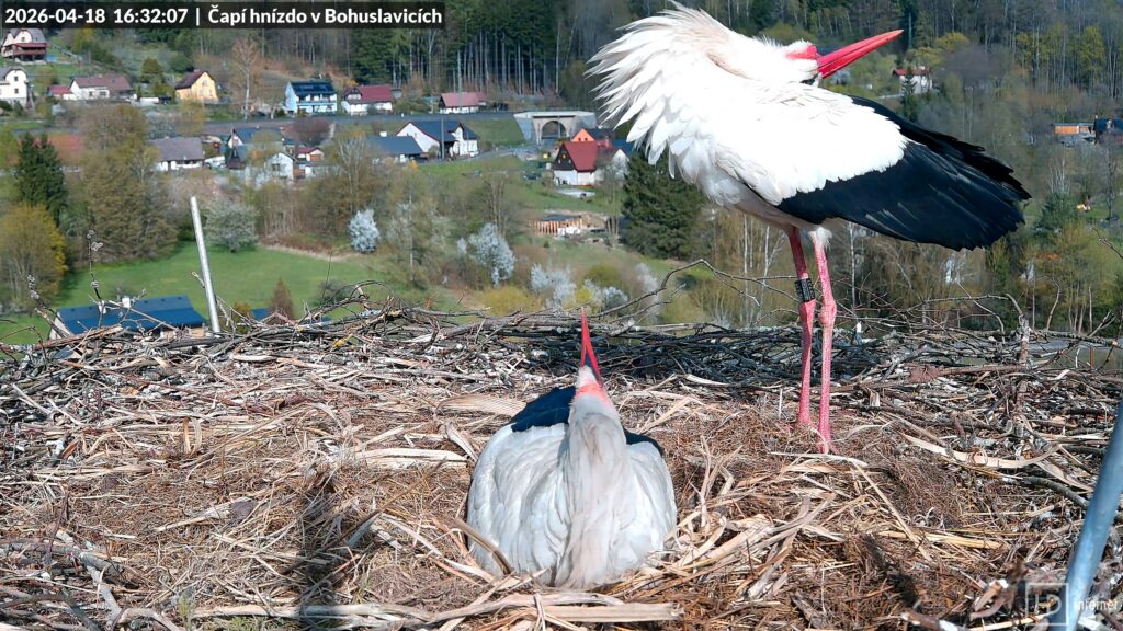 Při dalším příletu s větvemi se mu jednu z nich podařilo zapíchnout svisle do valu jako anténu, musel ji pak vytáhnout a uložit na správné místo. Bohunka věnovala dopolednímu lovu téměř dvě hodiny, Bohdan se mezitím povaloval v důlku. V poledne ho znovu rozvášnila prolétající poštolka, to už ale byla Bohunka zpět doma. Odpoledne vystoupala teplota za polojasné oblohy až na +20 °C, Bohdan se proto poprvé ochlazoval pomocí otevřeného zobáku. Postupující jaro se začíná projevovat i v okolí hnízda, stromy se nesměle zelenají a na několika místech kvetou třešně a švestky. Došlo i na opakované zastrašování před nám neviditelným narušitelem, Bohdan i Bohunka se rychle vraceli zpět bránit svůj domov.
