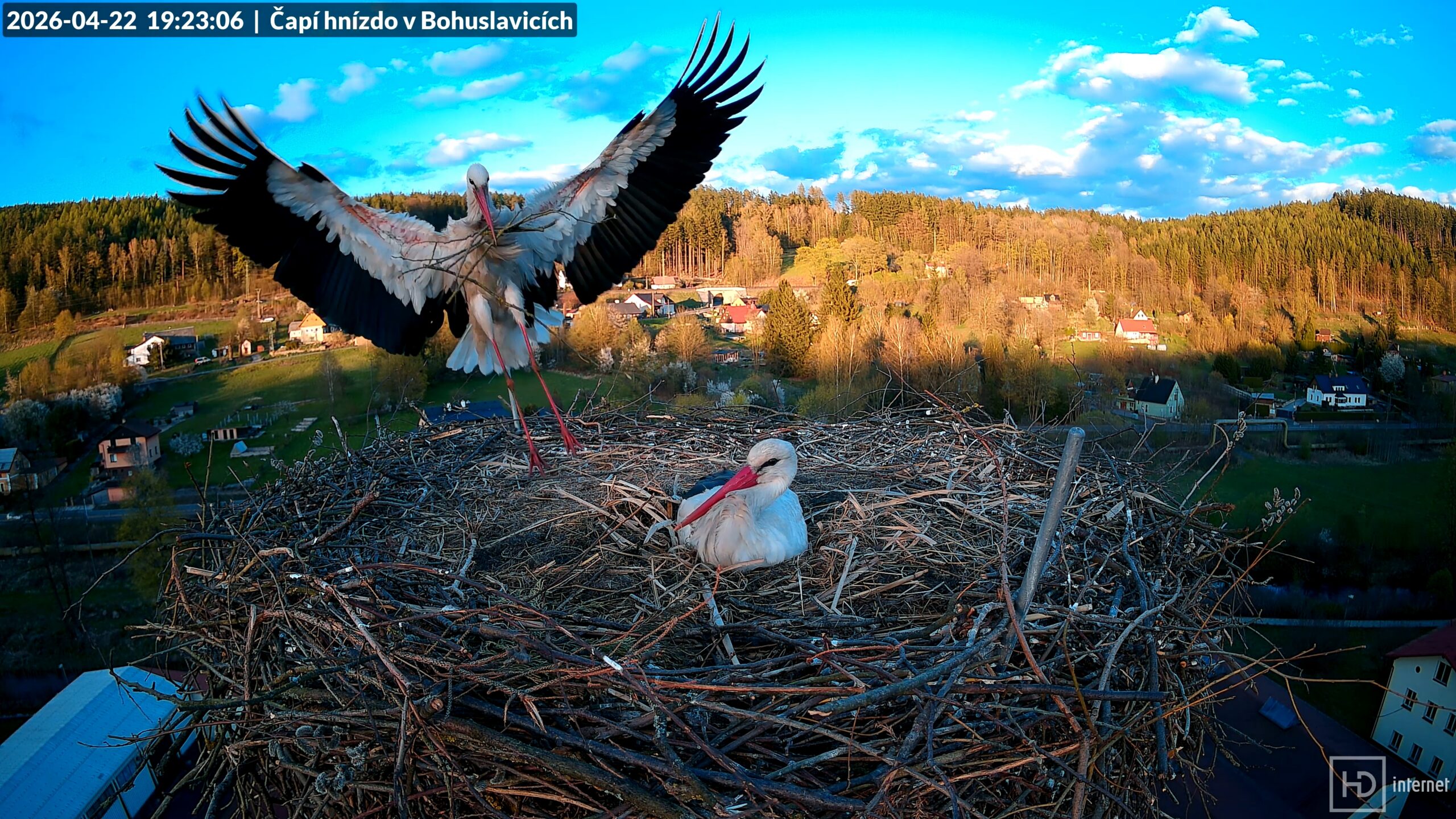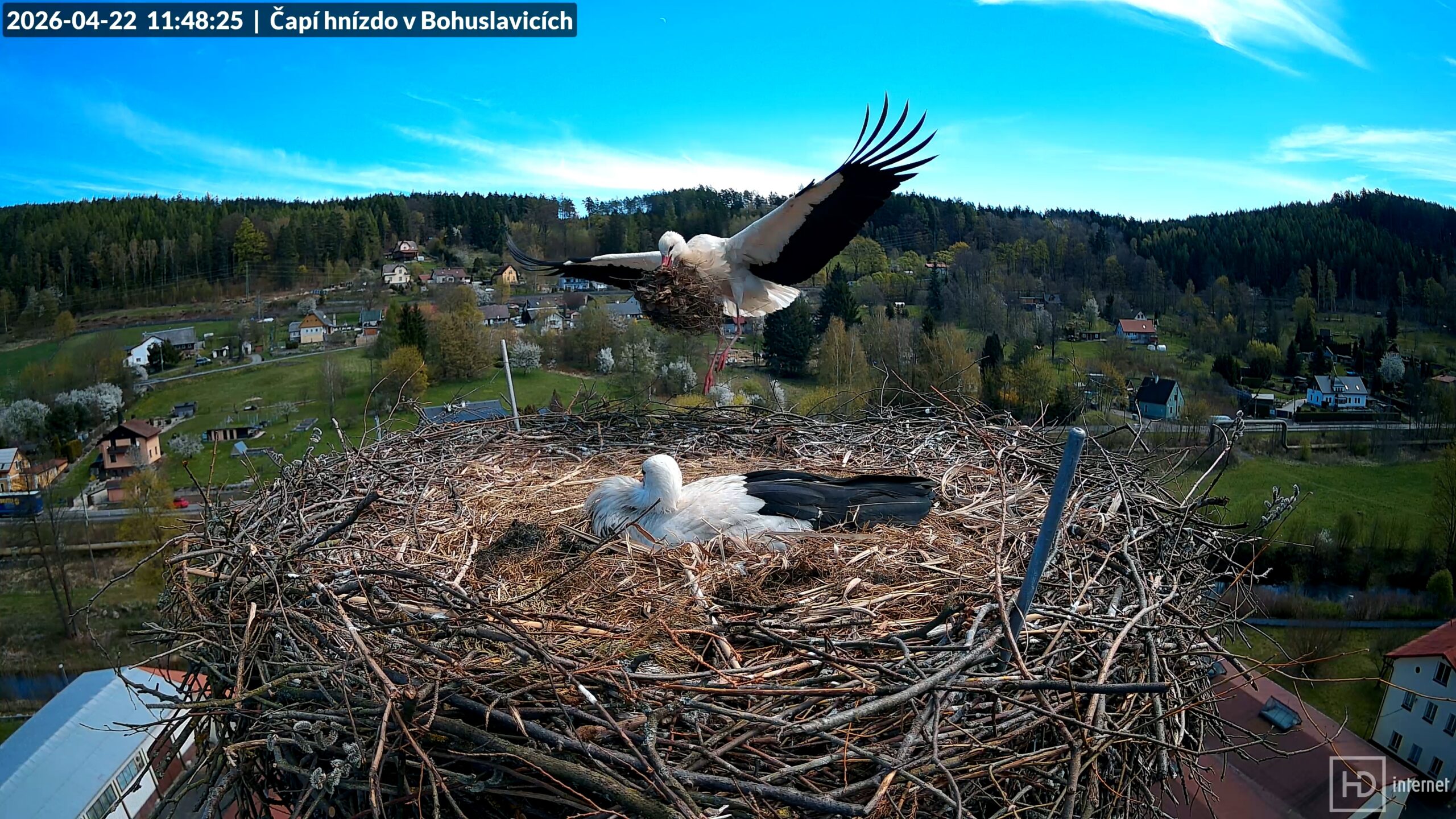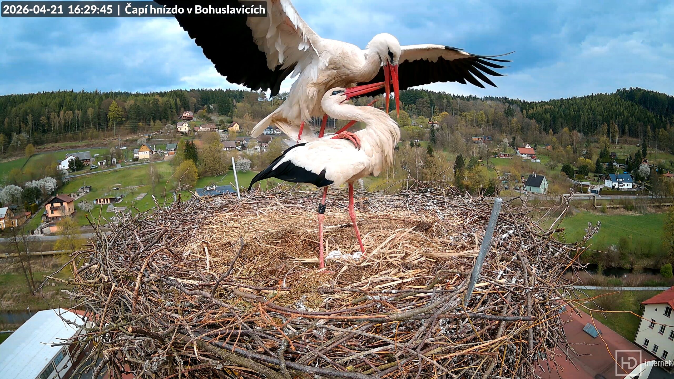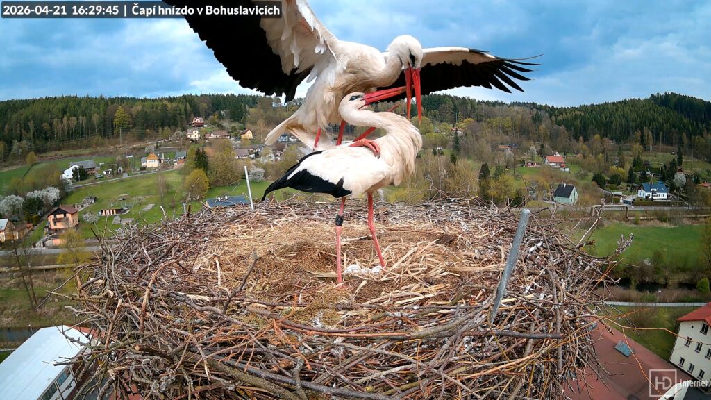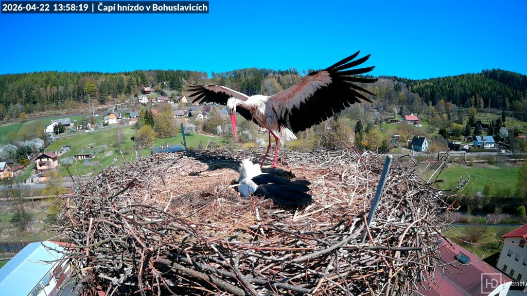 Dnes již můžeme s jistotou prohlásit období snášení v Bohuslavicích i Trutnově za ukončené. Bohunka i Magda snesly každá po pěti vejcích, žádné další v pondělí ani v úterý nepřibylo. I Puntička v Otovicích se dočkala s novým partnerem prvního vajíčka. Naopak v Mladých Bukách zůstává důlek nadále prázdný. Nyní jsou před námi ještě tři týdny inkubace, čápata by se měla začít líhnout v polovině května. Obvykle se jedná o nejklidnější období celé hnízdní sezóny. Jarní migrace se pozvolna chýlí ke svému konci, na hnízdech ruší především zvědavá nehnízdící mládež. Jak se ukázalo, pondělní klapající zvědavec zdejší hnízda velmi dobře zná. Pochází sice z Meziměstí, ale potuloval se v našem okolí už loni v srpnu. Čápa s kroužkem CZP CH244 jsme tehdy nazvali verbířem nebo také realitním agentem. Letos se opět vrátil, vyhlédnutá hnízda však našel obsazená. A první čápata v Česku se dnes vyklubala v Chebu.
