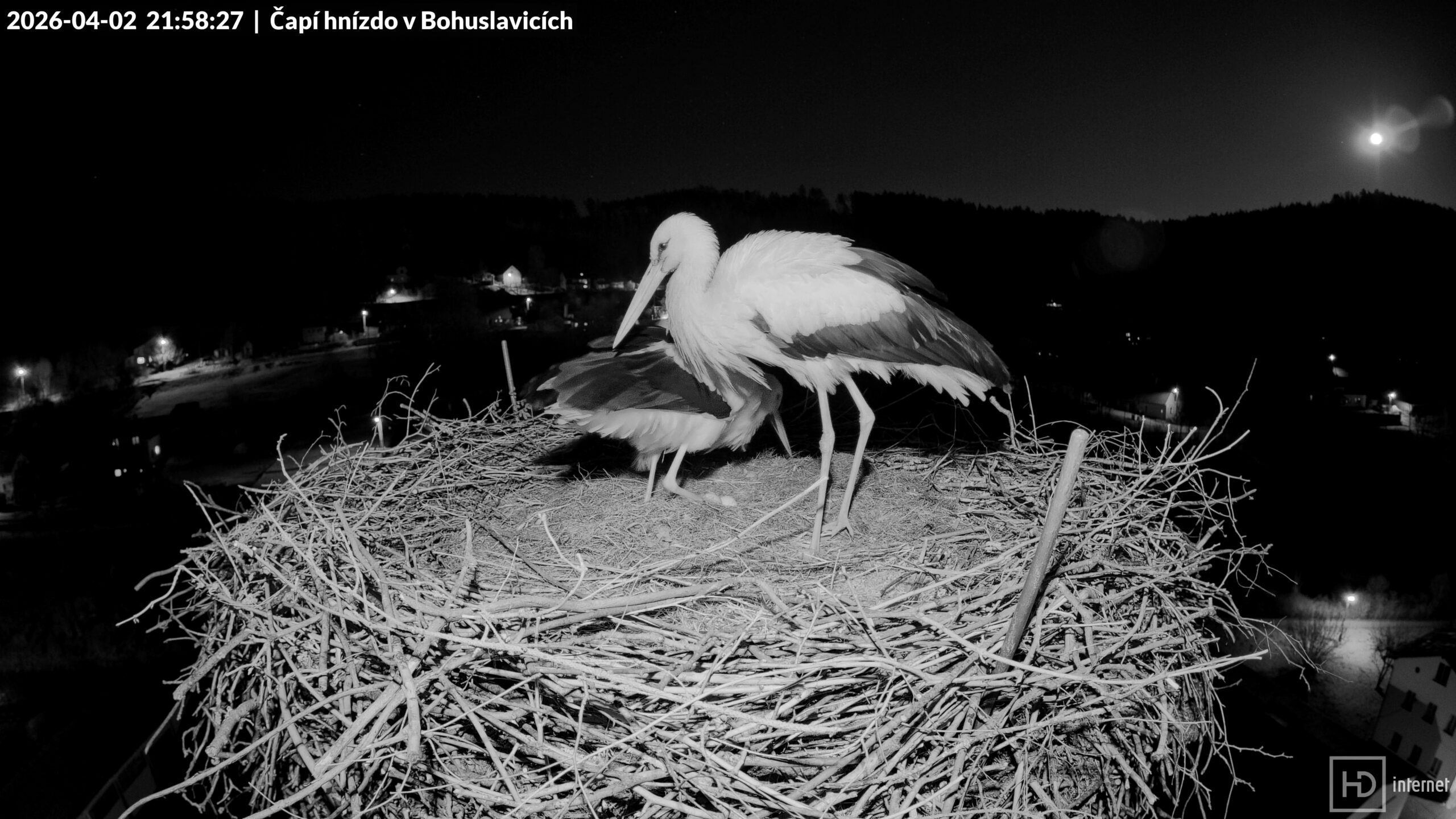 10.3.2026 18:47:36 první přenocování Puntíka čápa na hnízdě